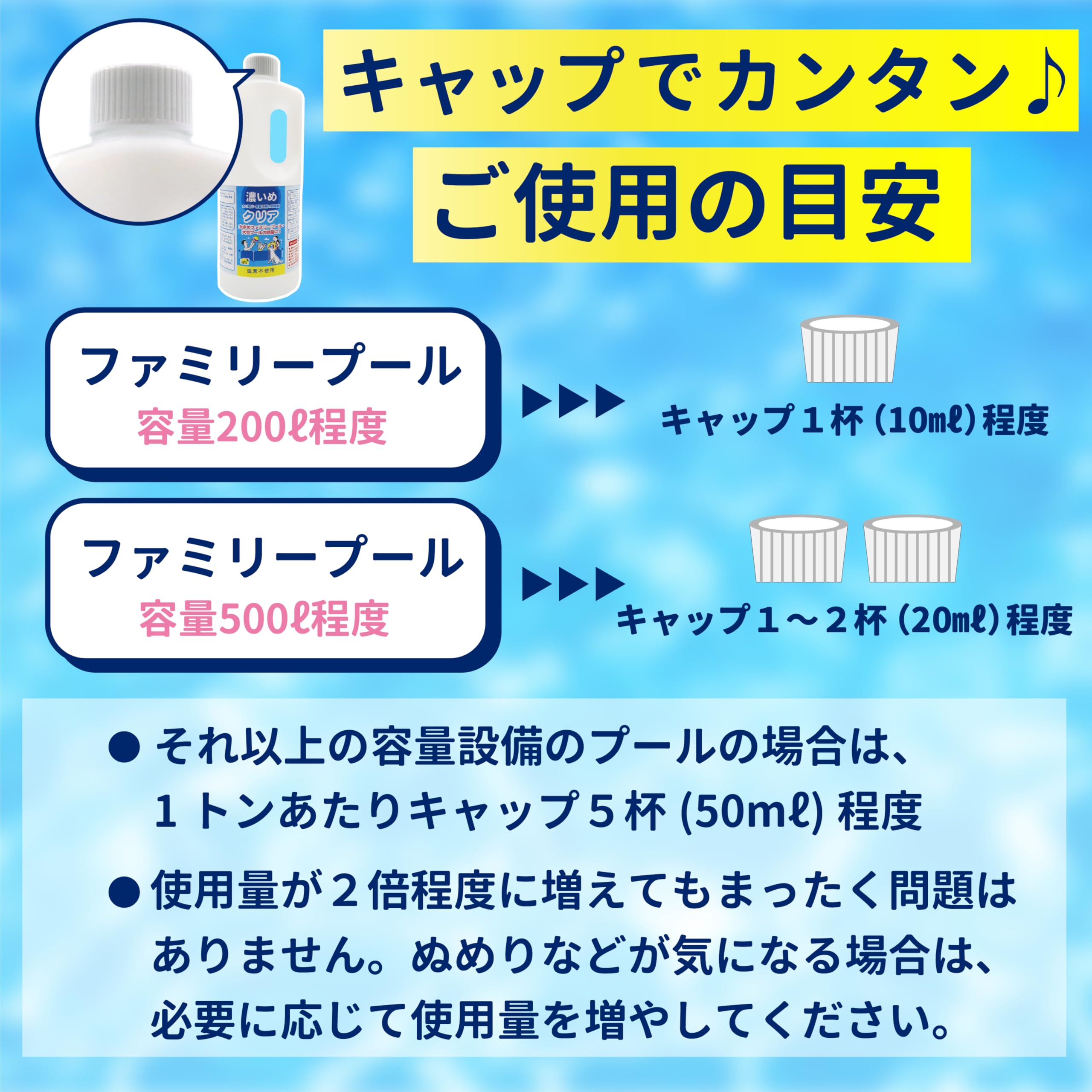 ??200?程度のファミリープールにはキャップ1杯(10?)、500?程度のプールにはキャップ2杯(20?)程度を投入して下さい(さらに大きな設備は1トンあたり50?が目安です)。2倍程度投入しても問題はありません。