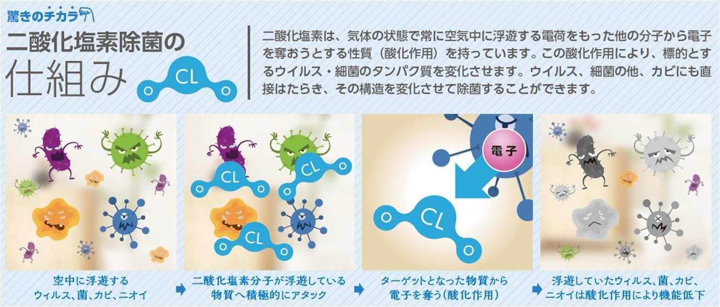 二酸化塩素分子のチカラであなたの身の回りに浮遊するウイルス・菌・ニオイを抑制します。