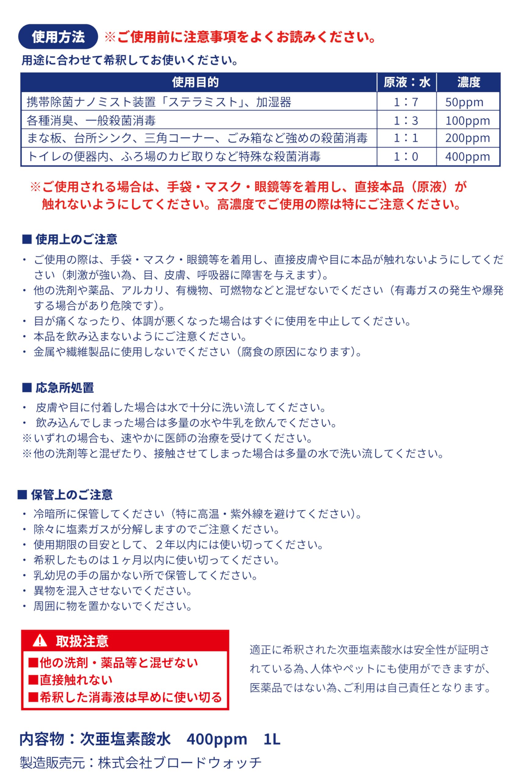 【内容物】次亜塩素酸水 1L(濃度約400ppm)
