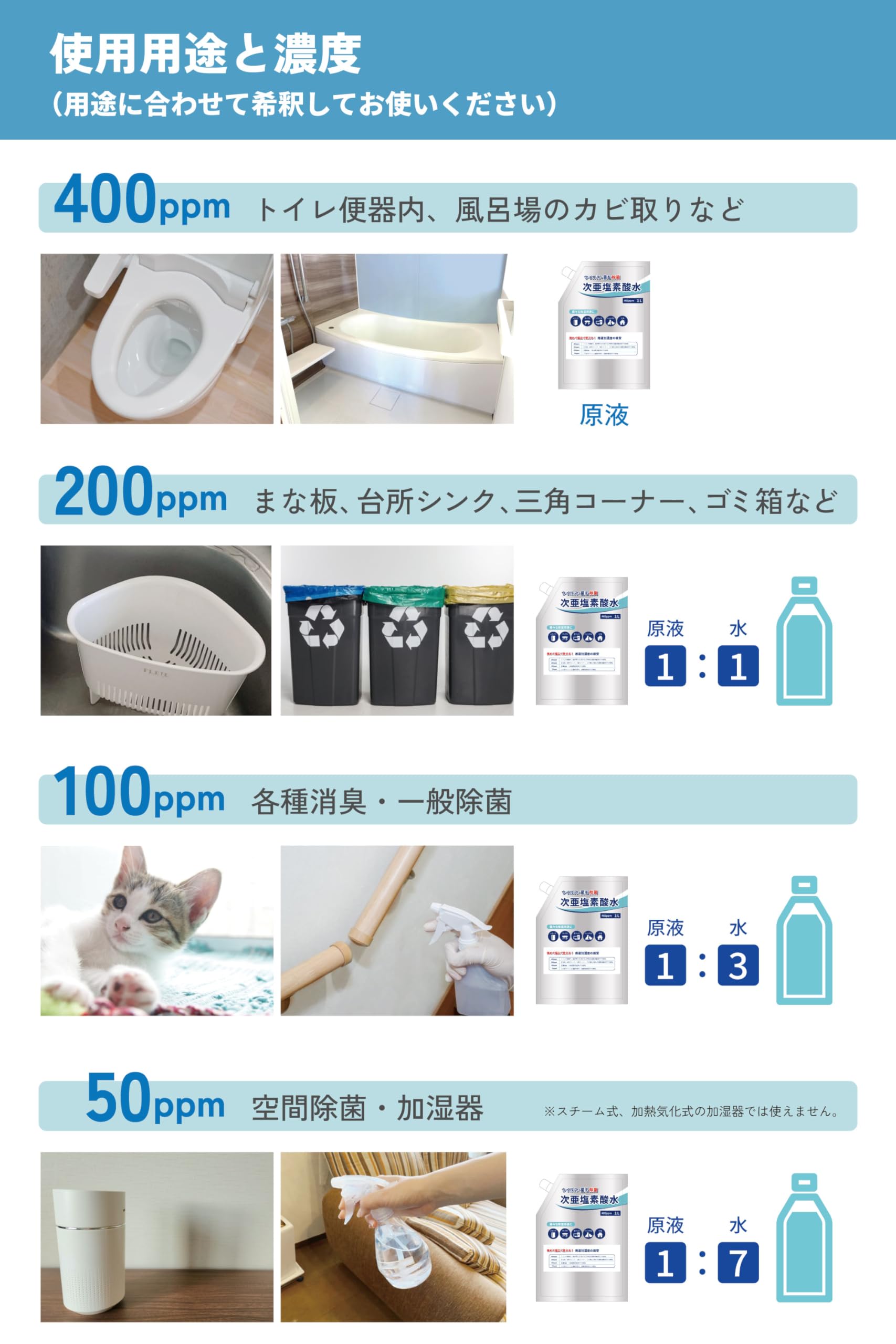 【面倒な作業は不要、薄めて使える希釈タイプ】中身を水道水で薄めるだけで様々な用途の次亜塩素酸水を作成できます。 8倍希釈で加湿器など空間除菌に最適な50ppm、現液のまま使用すればトイレの便器やお風呂のカビ取りなどでもご使用頂けます。