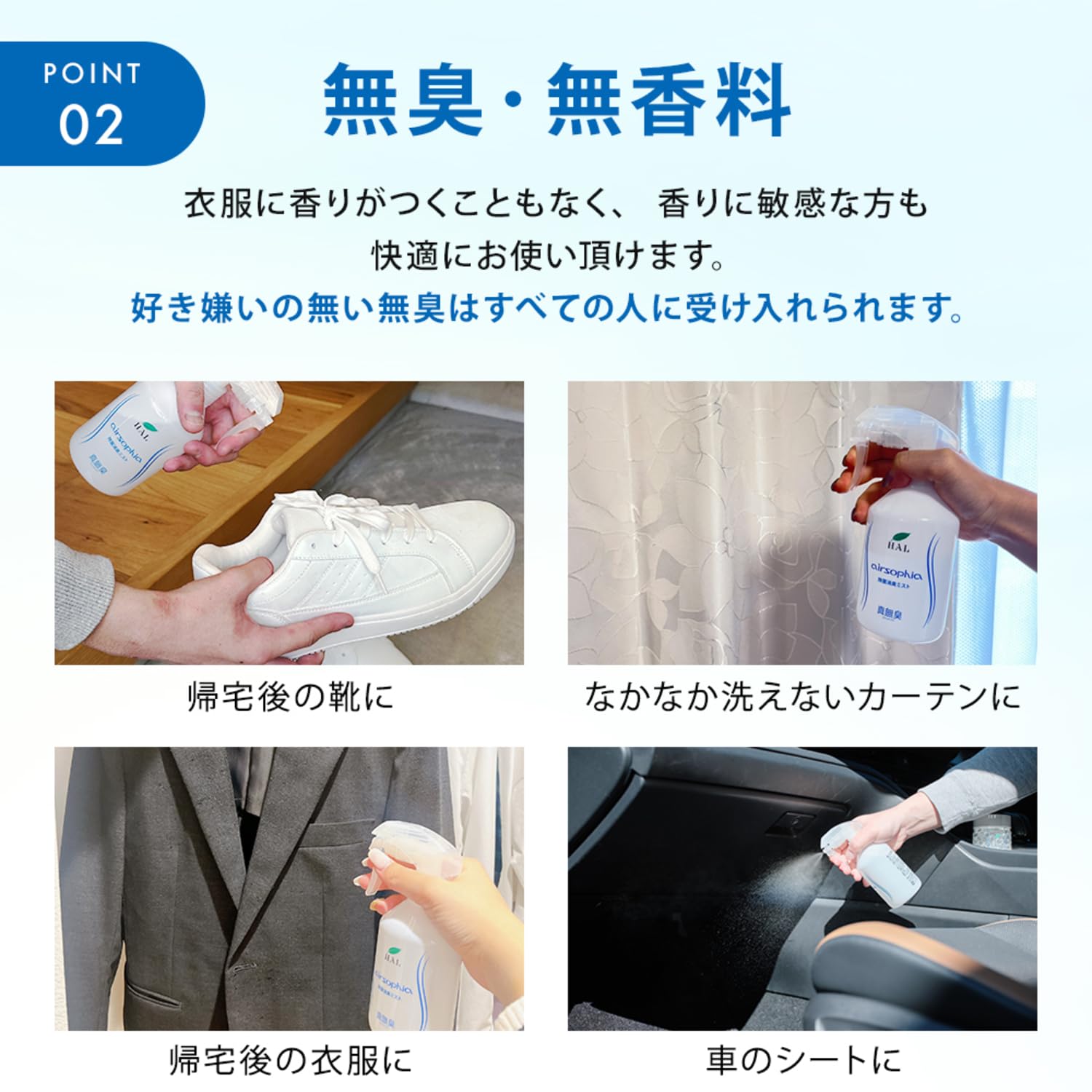 【無香料だから気にならない】消臭剤でも実際は香りでニオイを覆い隠している商品が多いですが、当製品はニオイの原因を中和・分解して「無臭化」する本物の消臭剤です。誰もがニオイを感じない「真無臭」という快適環境をご提案いたします。