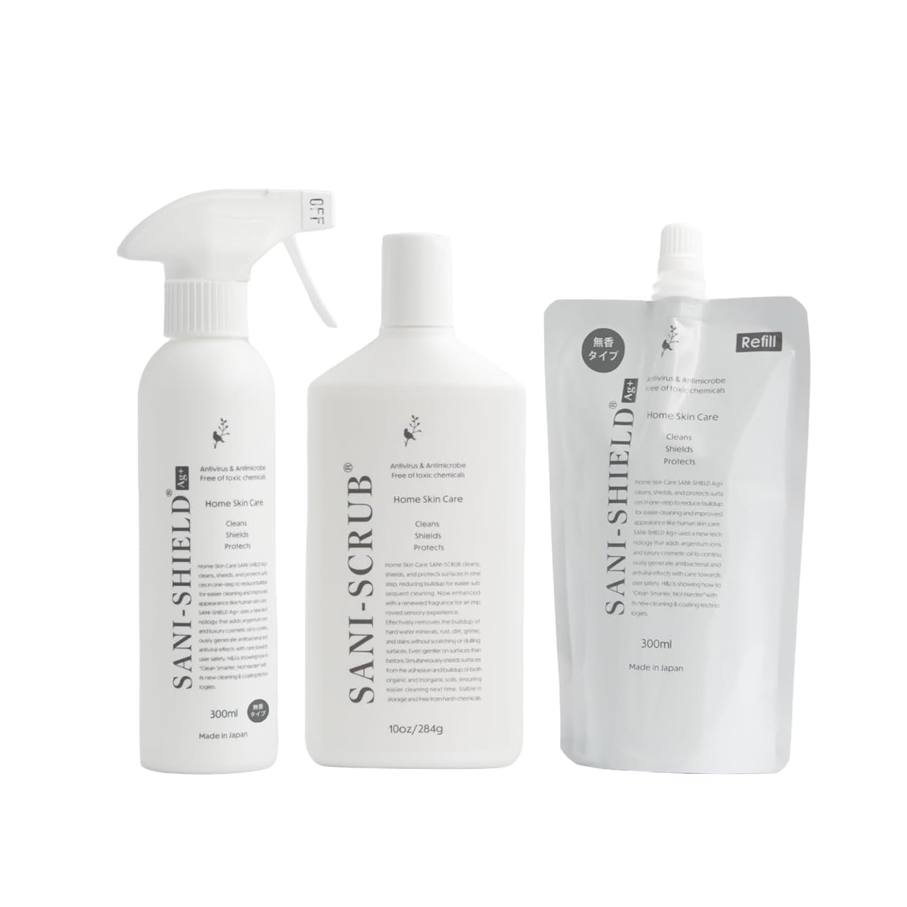 SANI-SHIELD サニーシールドAg+ 除菌スプレー クリーナー 中性 抗菌コーティング ウィルス 花粉 消臭 防カビ お掃除 洗浄 撥水 艶 ツヤ 手に優しい 古堅純子 銀イオン ペット臭 日本製 トリガー1本+詰替1袋+スクラブ1本 無香料