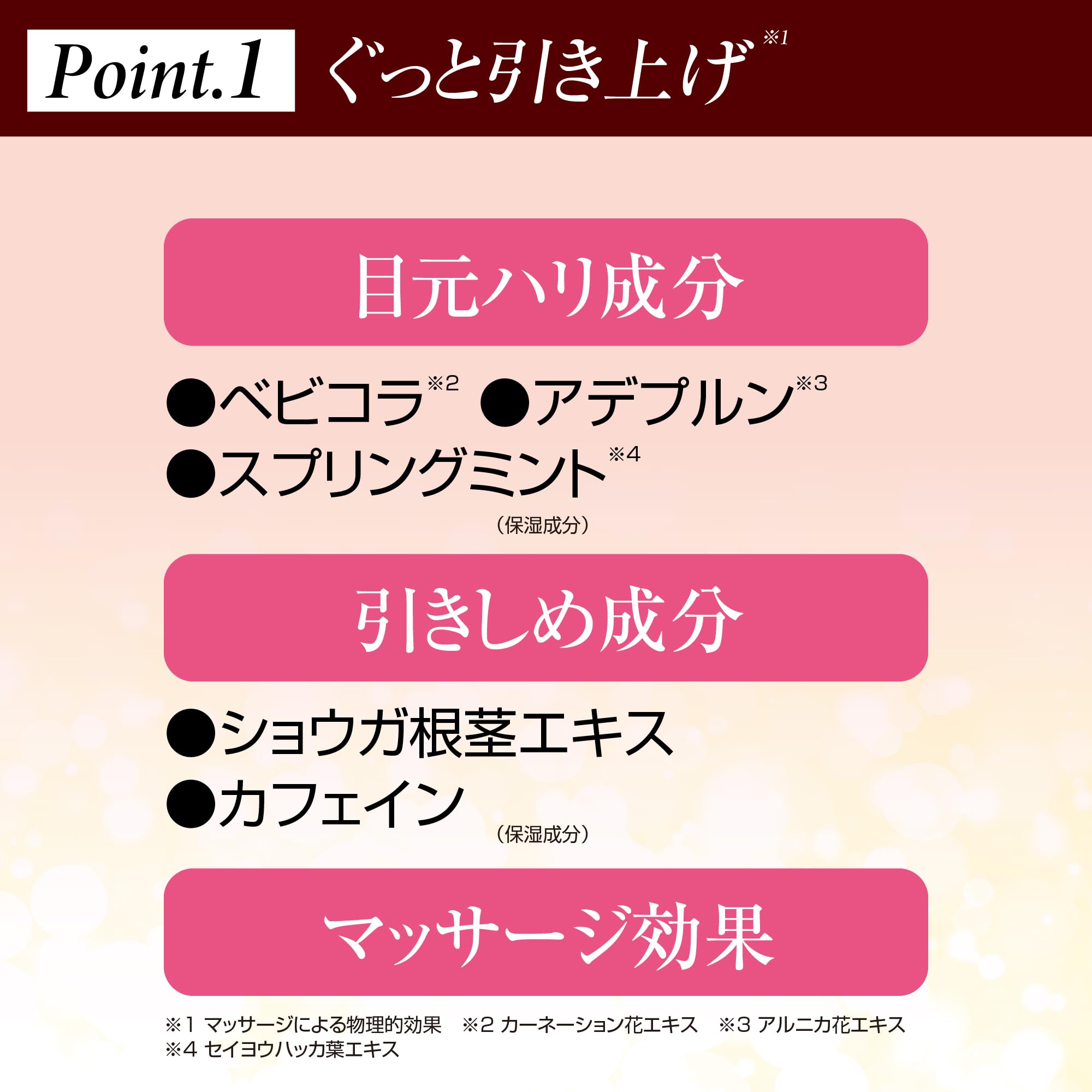 ・目元ハリ成分配合(カーネーション花エキス<ベビコラ>、アルニカ花エキス<アデプルン>、セイヨウハッカ葉エキス<スプリングミント>すべて保湿成分)