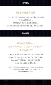 ・POINT03:健やかなお肌へ…:ブルーカーミングコンプレックス*1+Dermatic3*2 *1グアイアズレンスルホン酸Na、ツボクサエキス、グアバ葉エキス(いずれも整肌成分) *2サッカロミセス培養物、スギ葉エキス、ハス葉エキス(いずれも整肌成分)ダメージ*3にさらされたお肌にやさしくアプローチするエムロゼのブルーカーミングコンプレックスと共にDermatic3*2で肌の油分・水分バランスを整えしっとりとした肌へと導きます。 *3紫外線や大気中のチリなど