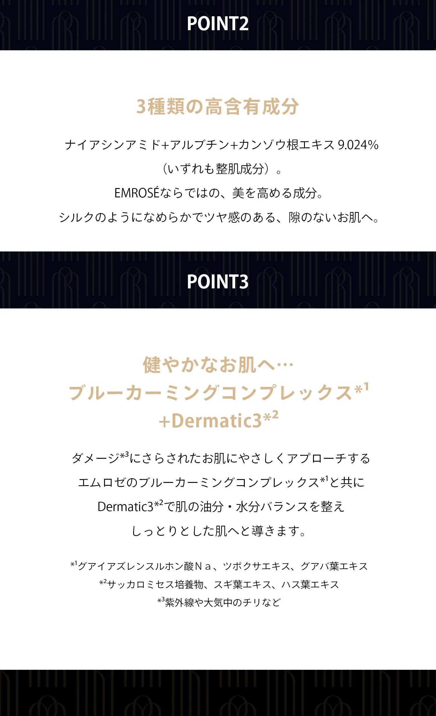 ・POINT02 3種類の高含有成分:ナイアシンアミド+アルブチン+カンゾウ根エキス 9.024%(いずれも整肌成分)EMROSEならではの、美を高める成分。シルクのようになめらかでツヤ感のある、隙のないお肌へ。