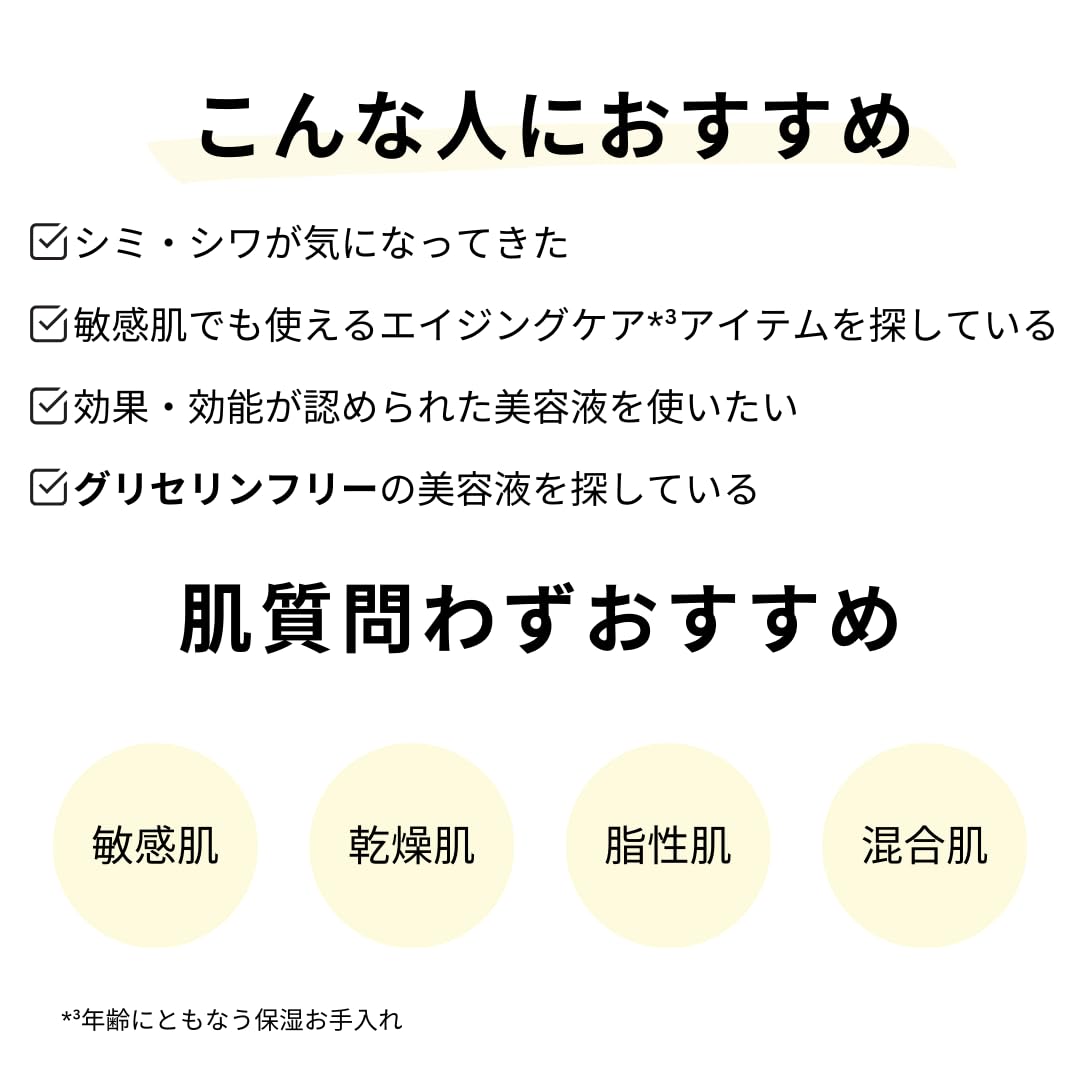 【おすすめの人】 ・シワを改善したい・シミ対策*1をしたい・シミ、シワが気になってきた ・敏感肌でも使えるエイジングケア*3アイテムを探している・効能効果が認められた美容液を使いたい・グリセリンフリーの美容液を探している