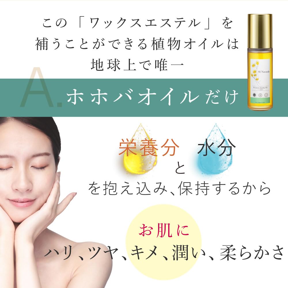 米国医学博士が開発、世界1523品種のホホバオイルの中で美容成分「ワックスエステル」を最も含有し、乾燥による小シワを目立たなくします(抗シワ試験クリア)。