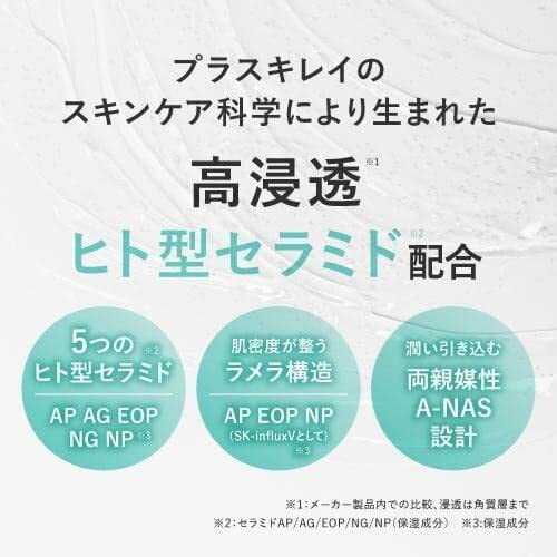 ・みずみずしい感覚を取り戻す。乾き、乱れた肌に。高保湿(*1)セラミド(*2)美容液。プラスキレイのスキンケア科学により生まれた高浸透(*1)ヒト型セラミド(*2)を配合しています。