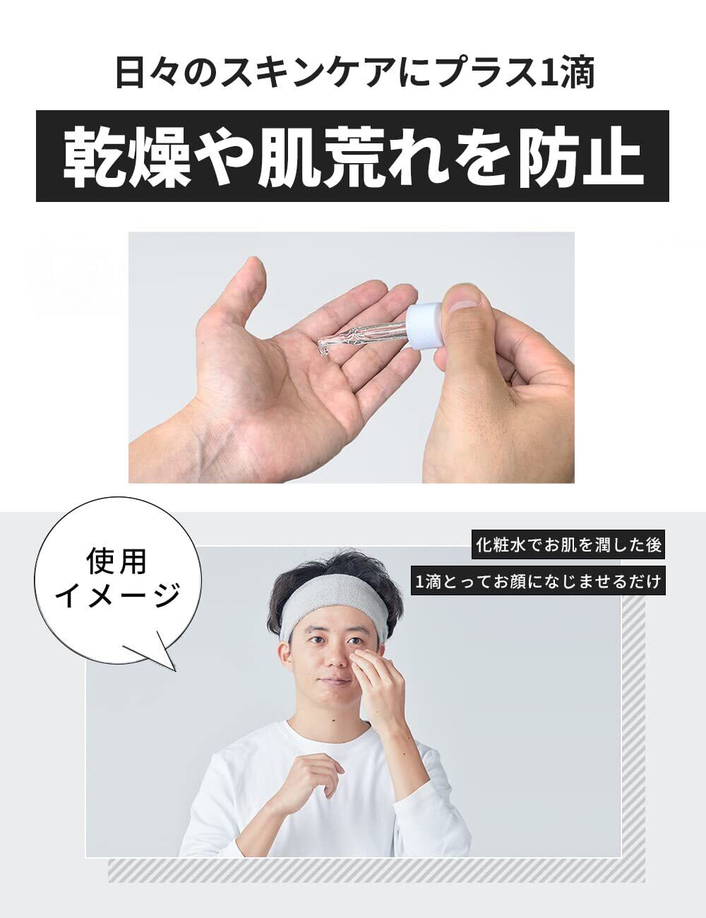 【日々のスキンケアにプラス1滴】化粧水でお肌を潤した後、本商品を1滴とってお顔になじませるだけ。日々のスキンケアルーティンにプラスしてお使いいただく美容液です。 【スタイリッシュなデザイン】品質はもちろんですが、男性が使いやすいようデザインにもこだわりました。 白を基調とした落ち着いた色合いを採用し、ご自宅の洗面所になじむようなシンプルなデザインにしております。