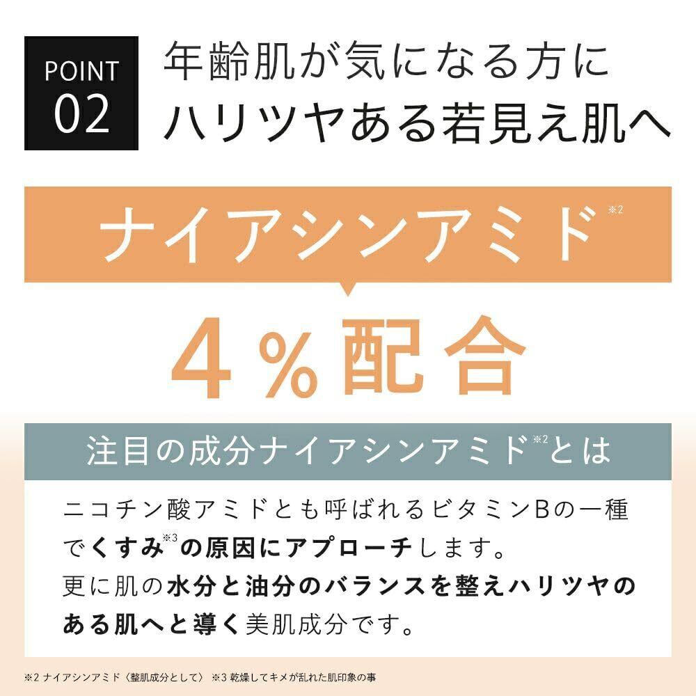 【注目の成分ナイアシンアミド※1を配合】年齢肌が気になる方にオススメです。ナイアシンアミドはニコチン酸アミドとも呼ばれるビタミンBの一種でくすみ※2の原因にアプローチします。更に肌の水分と油分のバランスを整えハリツヤのある肌へと導く美肌成分です。 ※1ナイアシンアミド(整肌成分として) ※2乾燥してキメが乱れた肌印象の事