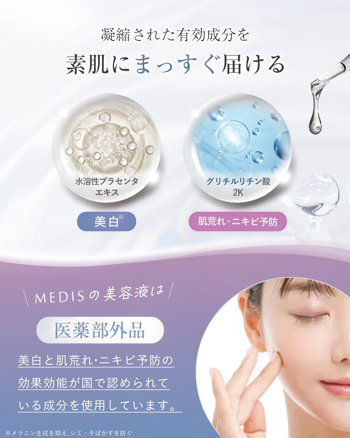 ✨️【MEDIS※美白美容液の特徴】持続型アミノ酸エクトインとヒアルロン酸を配合しており、紫外線でダメージを受けた肌を修復し、美白だけでなく様々なスキントラブルに対応したエイジング美容液です。