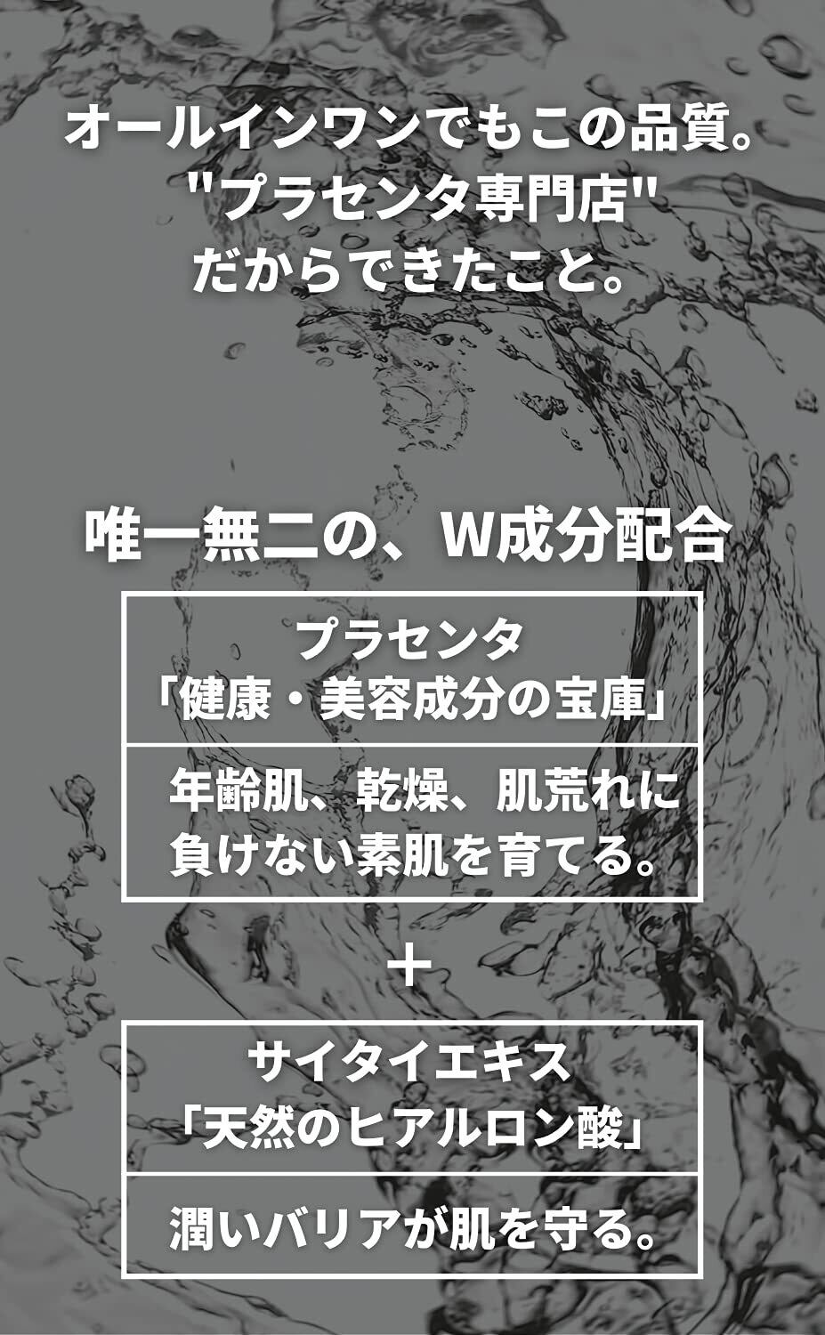 【特徴2】 プラセンタ 配合。創業25年の プラセンタ 専門店 が開発。 栄養成分 ・ 美容成分 の宝庫 「 プラセンタ 」に、 天然の ヒアルロン酸 「 サイタイ エキス 」を高配合。