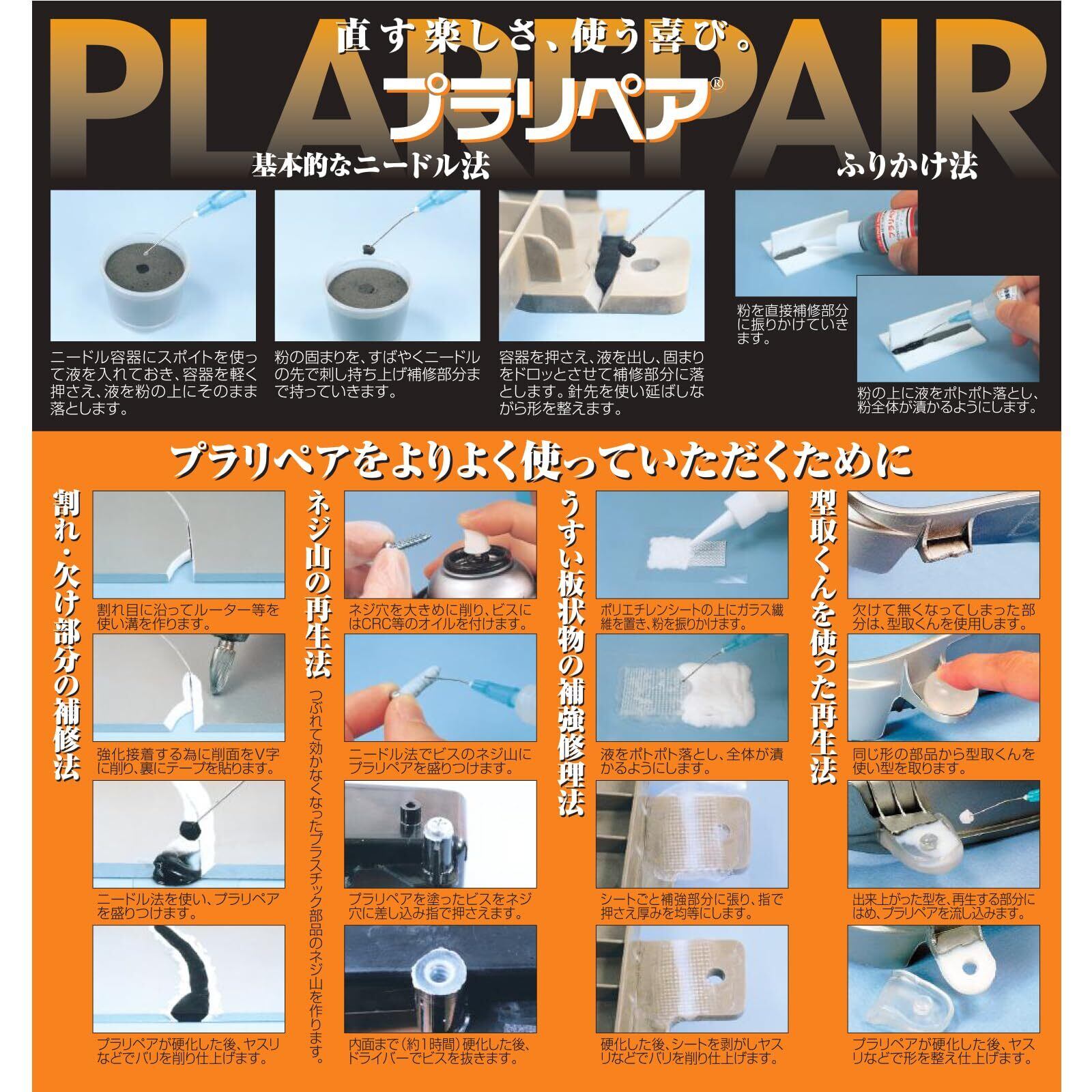 プラリペアは、合成樹脂のパウダーと専用リキッドを混合し重合硬化させる補修剤です。