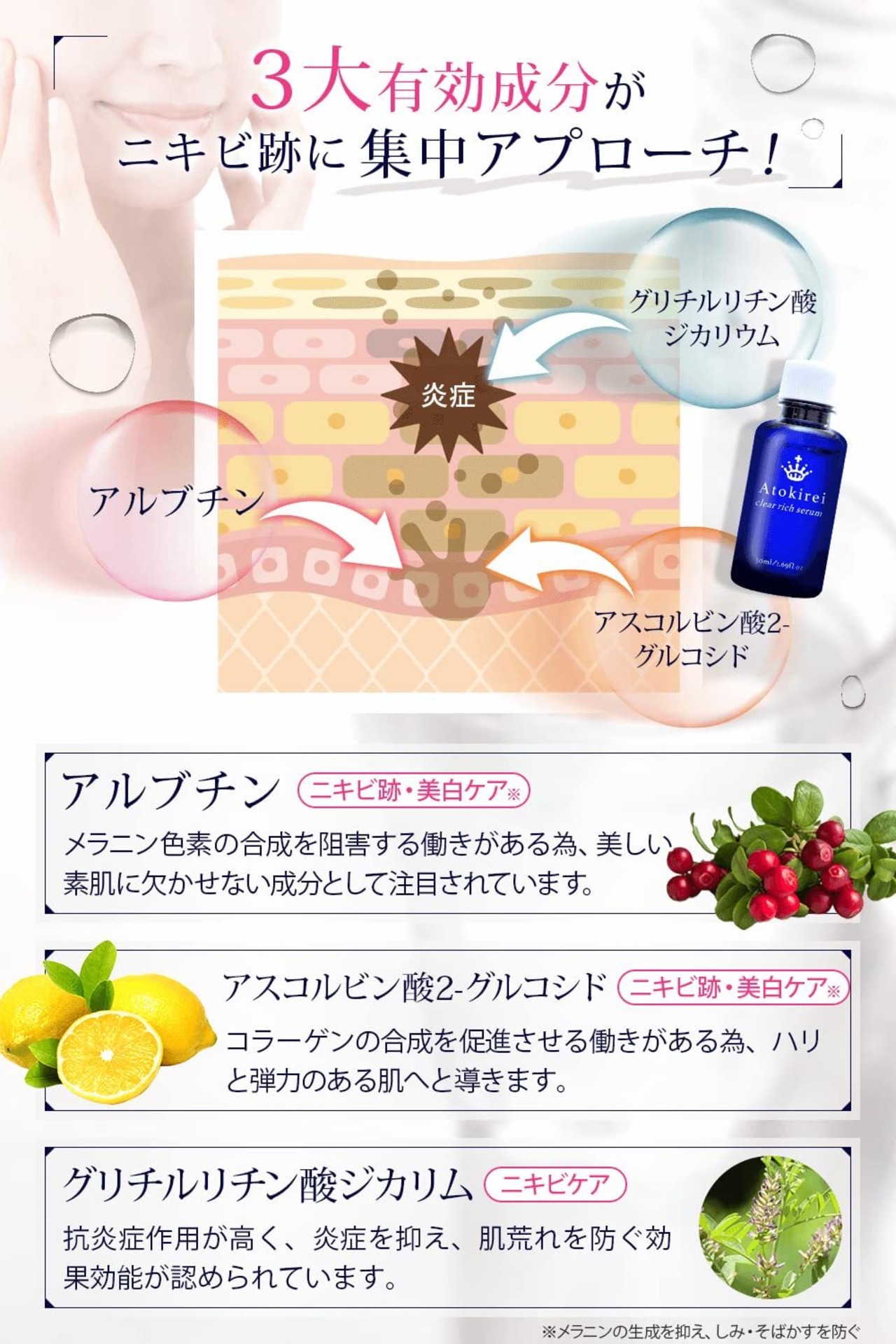 【ニキビ跡ケアの薬用美容液】3大有効成分を配合したニキビ、ニキビ跡ケア専用美容液Atokirei(アトキレイ)。しっとりとした潤いに満ちたテクスチャで、ツヤのあるやわらかな肌へ導きます。