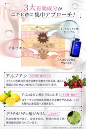 【3つの有効成分がアプローチ】グリチルリチン酸ジカリム、アルブチン、アスコルビン酸2-グルコシドが炎症を抑えて、肌荒れを防ぎます。またメラニンの生成を抑え、シミ、そばかすを防ぎます。