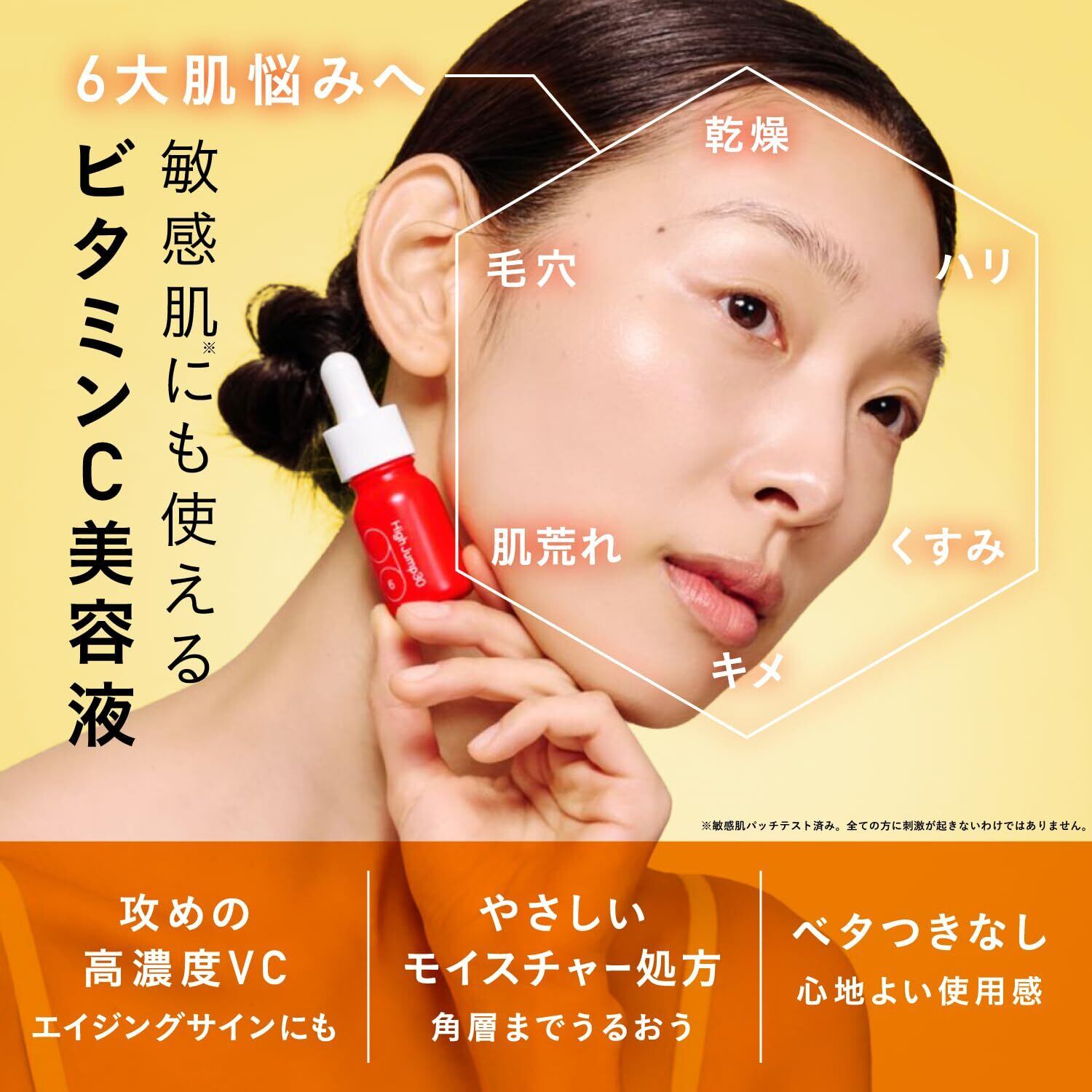 【低刺激設計の高濃度ビタミンC】化粧水の前に使用する導入美容液です。すーっと伸びがいいので、1回量はたった3滴でOK。朝晩の2回使用で、ワントーンあかるい肌へ。8つのフリー処方で低刺激設計。