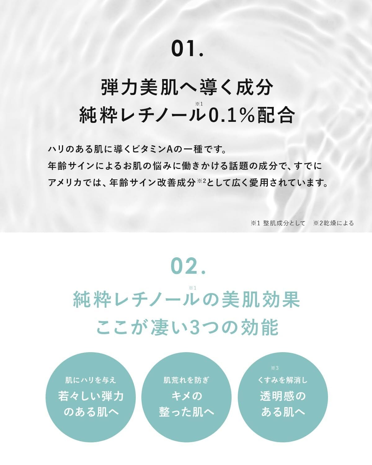 【純粋レチノールの美肌効果】年齢を感じるお肌のお悩みに、今話題の成分「純粋レチノール」がダイレクトに働きかけます。<肌にハリを与え、若々しい弾力のある肌へ><肌荒れを防ぎキメの整った肌へ><くすみ(※)を解消し透明感のある肌へ>※乾燥・キメの乱れによる