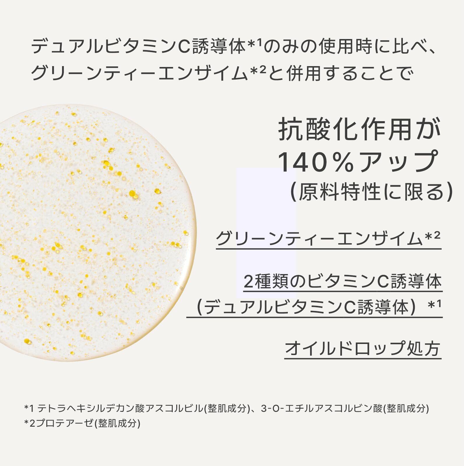 【透明肌ケア×角質ケア】 デュアルビタミンC誘導体*1が内側まで*2しっかり浸透する一方グリーンティーエンザイム*3で古い角質をやさしく除去し明るい肌印象へ