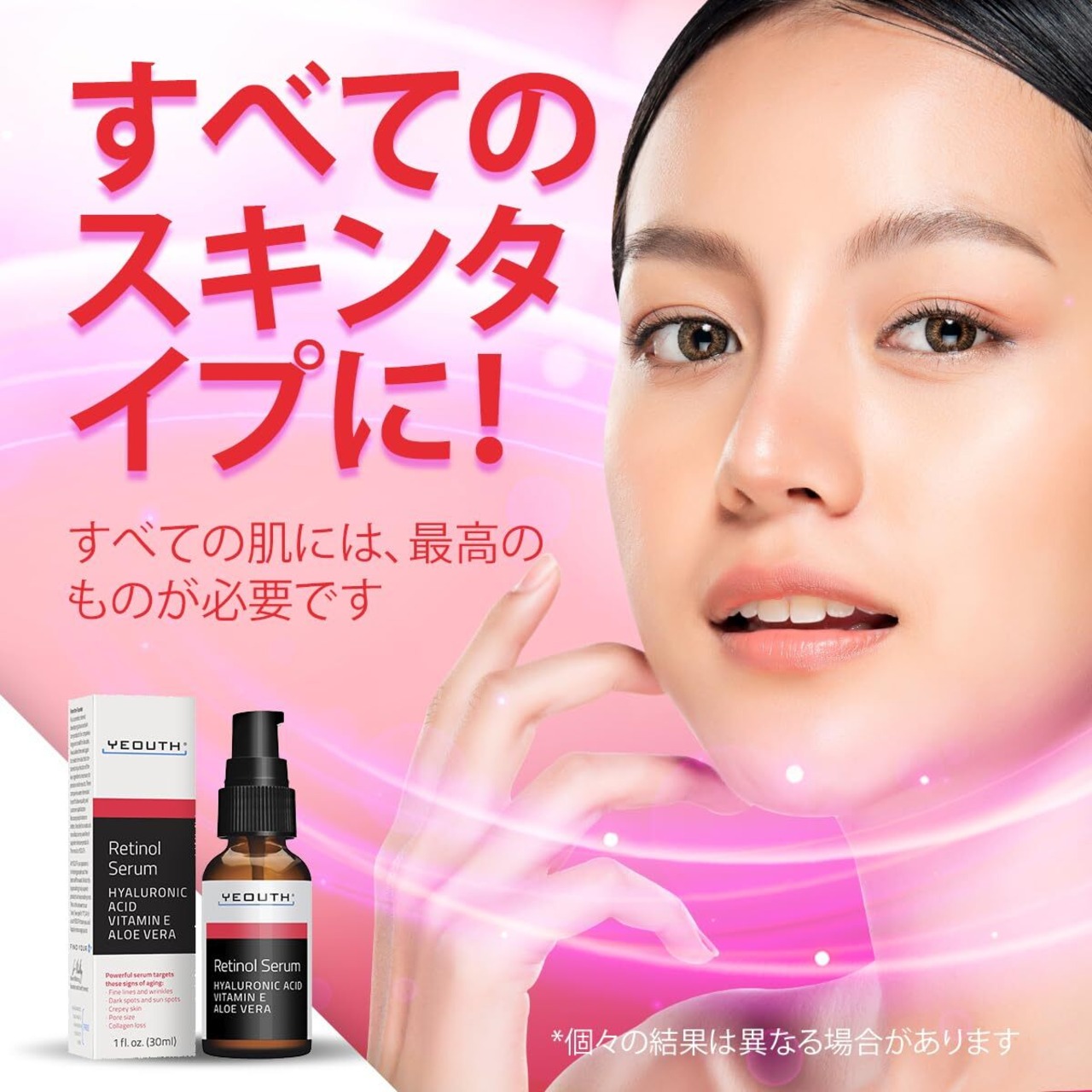 YEOUTH Retinol Serum Hyaluronic Acid,ビタミンE 美容液、ヒアルロン酸、アロエベラを豊富に含んでいます。美容 保湿 力に優れたレチノール配合の夜用美容液。ビタミンcセラム YEOUTHのスキンケア商品との併用にです。これらの成分を丁寧に配合し、こだわりの詰まった1本を作りました。毎日の美容ケアに是非お試しください。スキンアンドラブ レチノール YEOUTHのスキンケア。