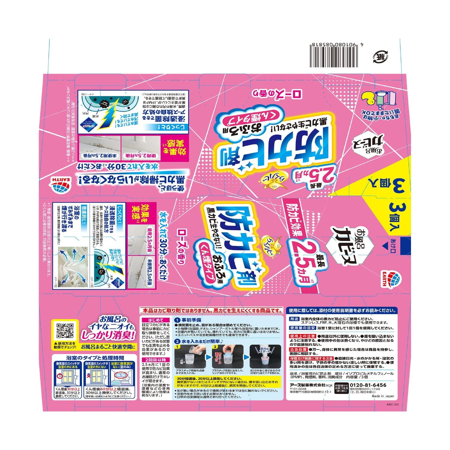 らくハピ お風呂カビーヌ 防カビくん煙剤 ローズの香り 3個パック 浴室 カビ予防 カビを防ぐ 防カビ剤 くん煙タイプ お風呂掃除 大掃除