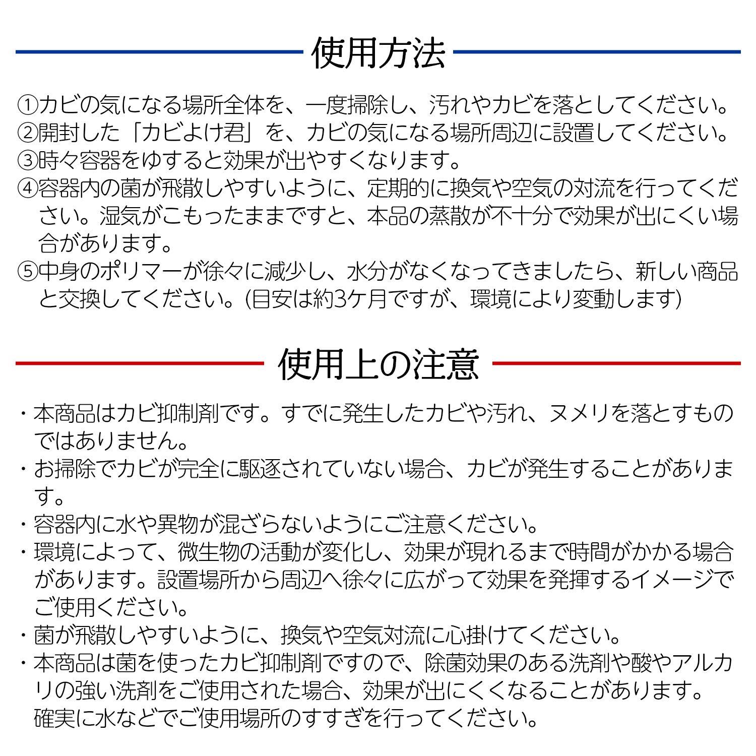 ●使用方法(置くタイプ共通):カビの気になる場所全体を、一度掃除し、汚れやカビを落としてください。開封した「カビよけ君」を、カビの気になる場所周辺に設置して下さい。時々容器をゆすって、中のポリマーを混ぜるとより効果が出やすくなる。容器内の菌が飛散しやすいように、定期的に換気や空気の対流を行って下さい。湿気がこもったままですと、本品の乾燥が不十分で効果が出にくい場合がある。中身のポリマーが徐々に減少し、水分がなくなってきたら、新しい商品と交換して下さい。(環境によるが約2ヶ月)