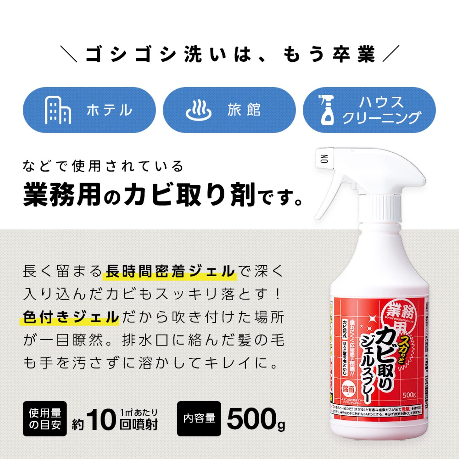 【業務用】ハウスクリーニング屋さんが使っている業務用。長く留まる長時間密着ジェルで深く入り込んだカビもスッキリ落とす! 色付きジェルだから吹き付けた場所が一目瞭然。排水口に絡んだ髪の毛も手を汚さずに溶かして綺麗に。