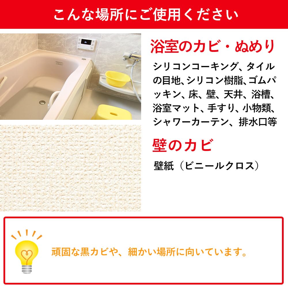【使用できないもの】ホーロー、アルミニウム、真ちゅうなどの金属製品など( 錆の原因になる)・獣毛のハケ、ブラシ・しっくい壁・クロス壁・一部ユニットバスの化粧鋼板壁・浴槽栓などゴム部分など