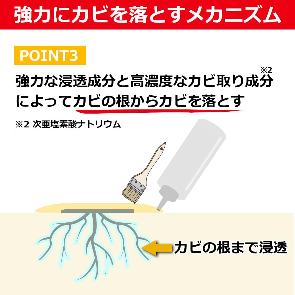 【カビの根まで浸透し、長時間効果を発揮】 強力な浸透成分と高濃度なカビ取り成分がカビの奥まで浸透し、長時間作用。こすらず放置するだけで根こそぎ除去。