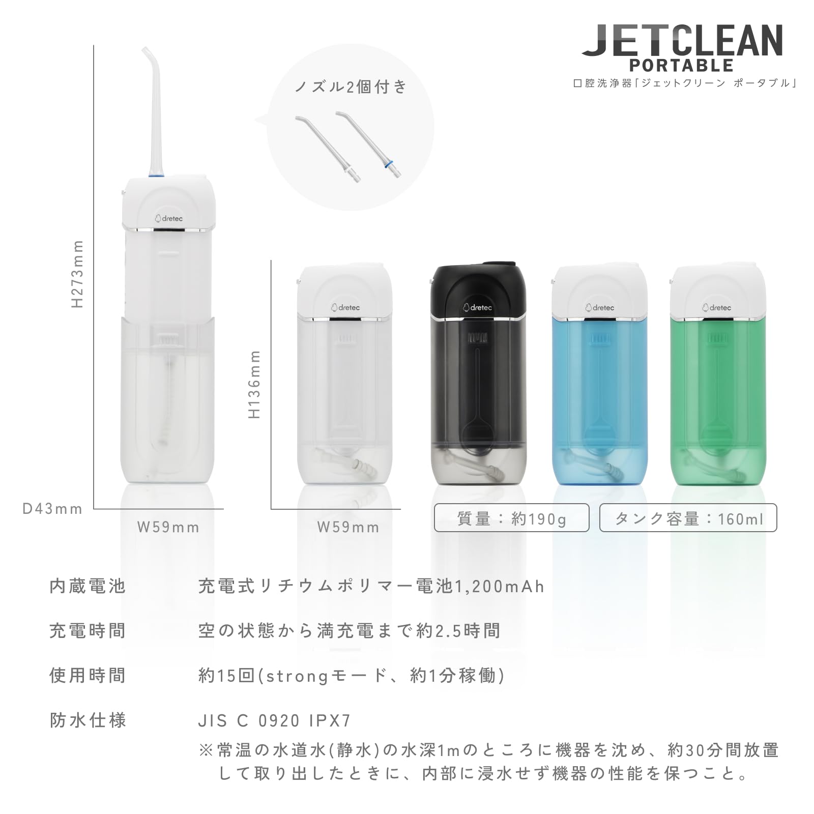 dretec(ドリテック)口腔洗浄器 携帯用 小型 ジェットクリーン ポータブル USB 強力洗浄 5モード フロス IPX7防水 160ml 充電式 充電コード ノズル2個付き ブラック