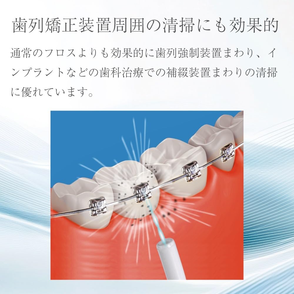 【極細ジェット水流】歯ブラシだけではアクセスできない狭いスペースにも0.6㎜の極細ノズルから繰り出す水流で歯垢、汚れを効果的に洗い流します。 歯肉も適度に刺激し歯周病予防にもご使用いただけます。