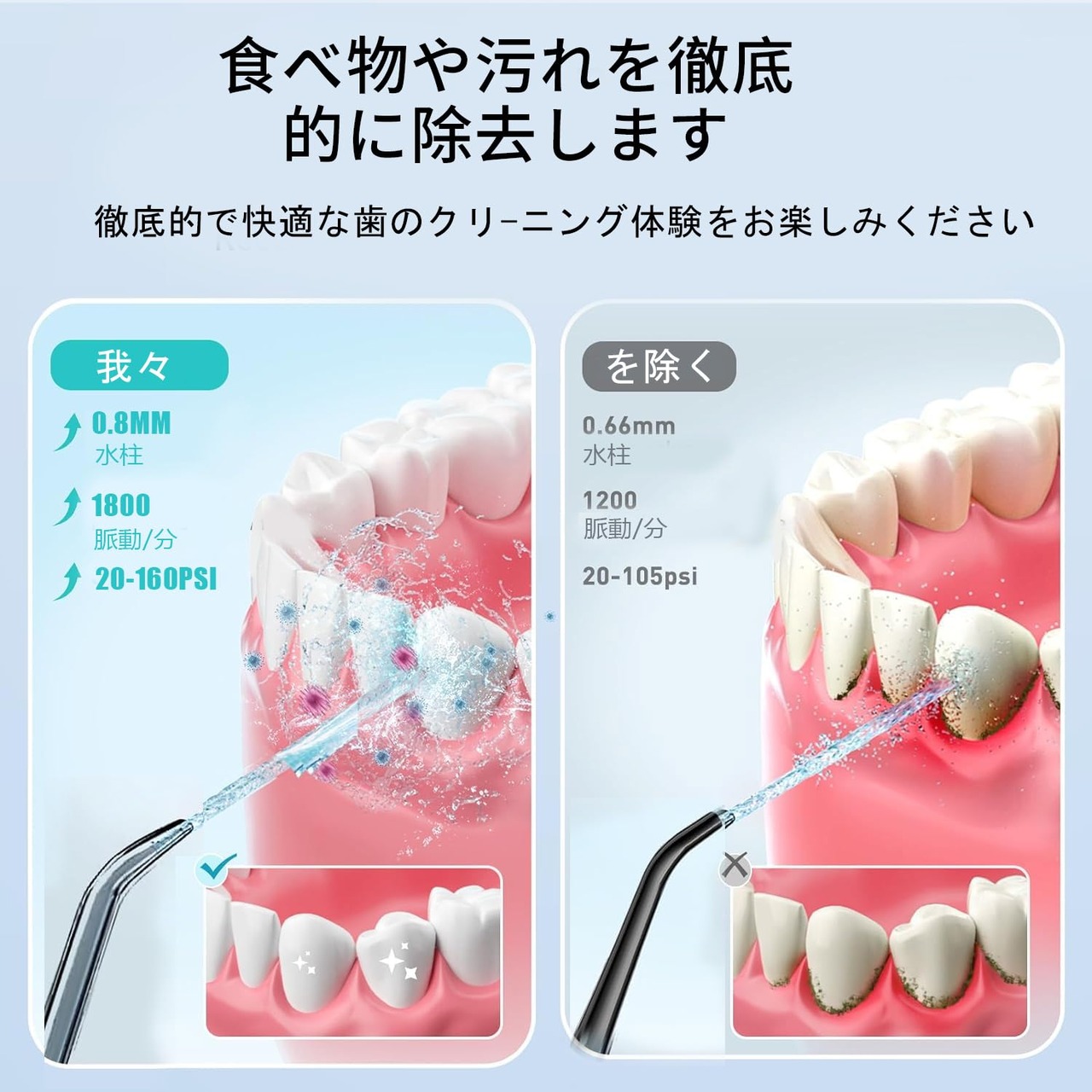 【5つの水圧モード / 徹底的な口腔衛生ケア】 歯科用口腔洗浄機は、1分間に1800回のパルスを備え、20から160 Psi。これにより、個々の口内健康に基づいたカスタマイズされた口腔灌漑ソリューションが可能です。「5種類の水流モード・360度回転ノズル」歯茎の状態や使用する目的に合わせて、水流の強さを選DIY、べるパルス、柔らかい、ノーマル、強力5つの水流モードが搭載されています。お子さんから大人・シニアの方まで、さまざまな口内状況に対応してくれます。(ご注意:初心者、子供、歯茎が弱い方はソフトモードをお勧めします。)歯の高圧洗浄機のノズルが360度に回転できる設計され、あらゆる角度で徹底的なクリーニングをします。