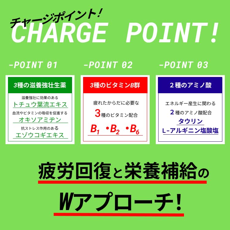 【成分・分量】(100ml中)オキソアミヂン50mg、エゾウコギエキス30mg(エゾウコギとして600mg)、トチュウ葉流エキス0.2ml(トチュウヨウとして200mg)、タウリン1500mg、L-アルギニン塩酸塩50mg、チアミン硝化物10mg、リボフラビンリン酸エステルナトリウム5mg(リボフラビンとして3.93mg)、ピリドキシン塩酸塩10mg、無水カフェイン50mg