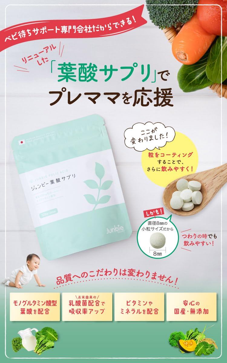 セットになる葉酸サプリは、国内のGMP認定工場で生産。厚生労働省が推奨する「モノグルタミン酸型葉酸400μg」をはじめ、「お米由来の乳酸菌」「20種類以上のビタミン・ミネラル」「鉄分・カルシウム」をバランス良く配合しています。直径8mmの小粒サイズをさらにコーティングすることで飲みやすさにも徹底的にこだわり、ベビ待ちママの迎える準備をサポートします。