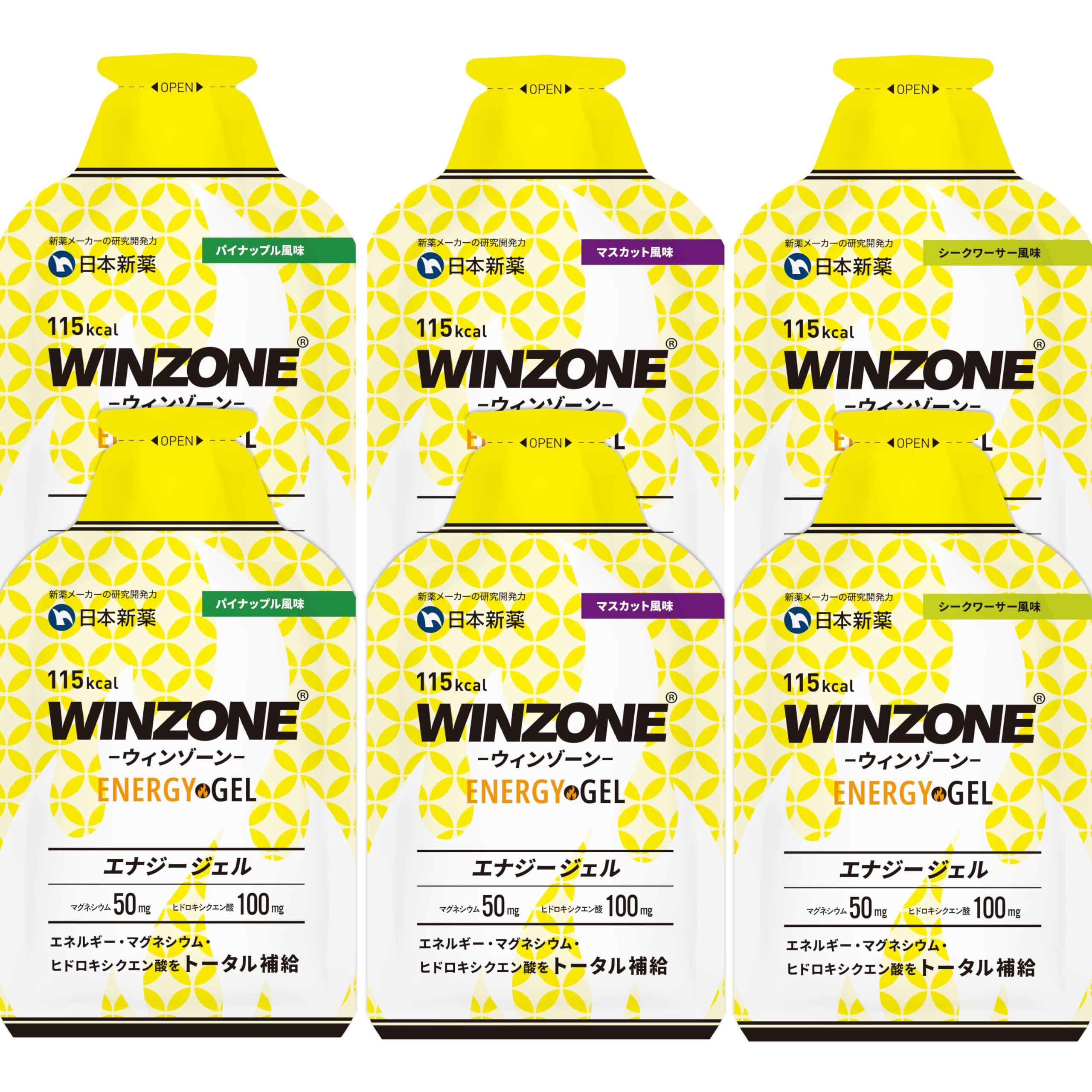 日本新薬 WINZONE(ウィンゾーン)フルマラソン完走セット エナジージェル 3味6袋(パイナップル、マスカット風味、 シークワーサー風味2袋) 国内製造 ヒドロキシクエン酸 マグネシウム エネルギー補給 マラソン 補給食