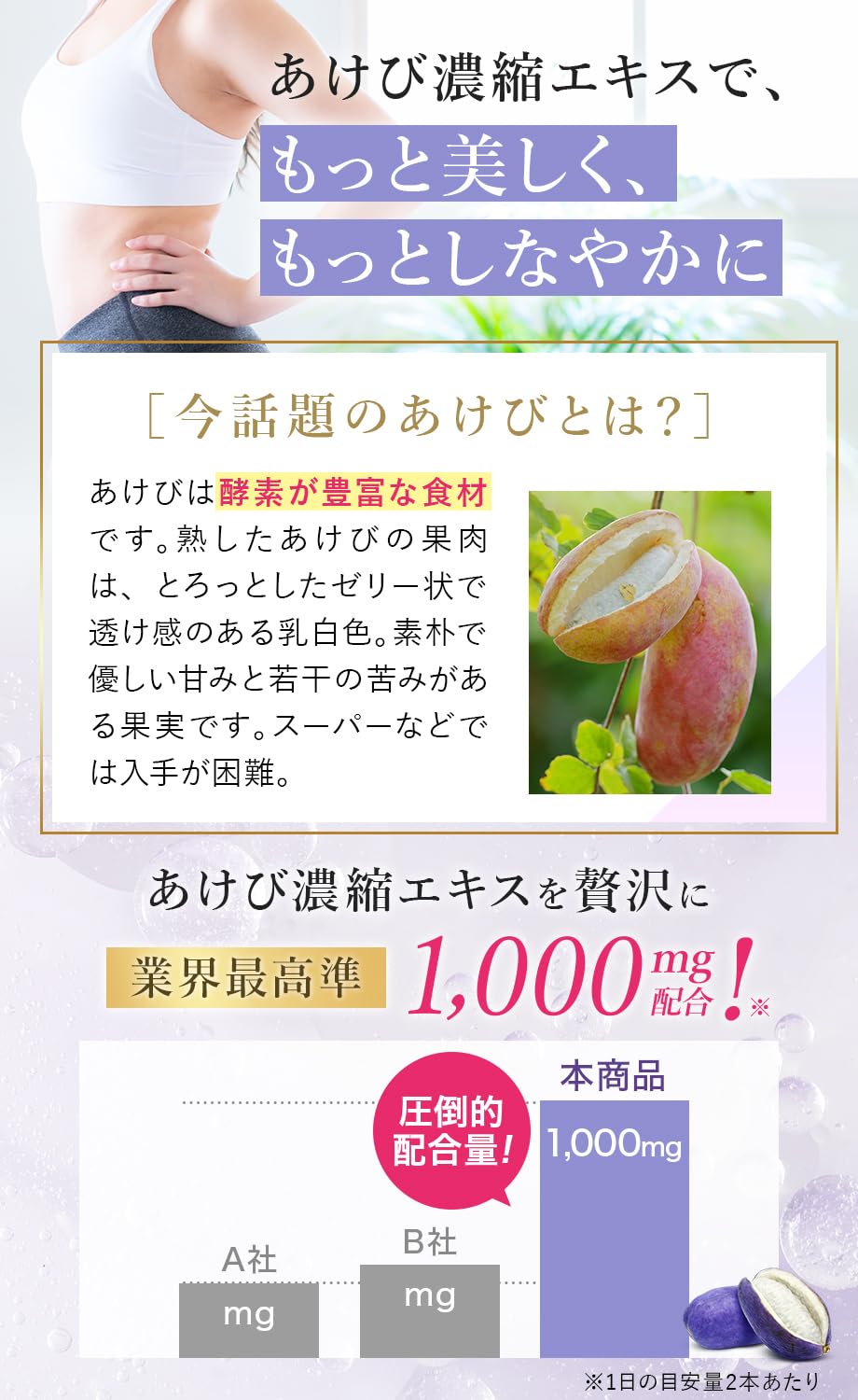 ?【アケビの濃縮エキスを配合】配合量が段違い!あけびの実から抽出した濃縮エキスを1,000mg配合(1日分の目安量2本あたり)。「とにかくあけびを摂りたい!」という方にはうれしい配合量です。あけびには苦み成分のサポニンが含まれていますので、後味で若干の苦みを感じることがありますが、これがあけびが含まれている証でもあります。