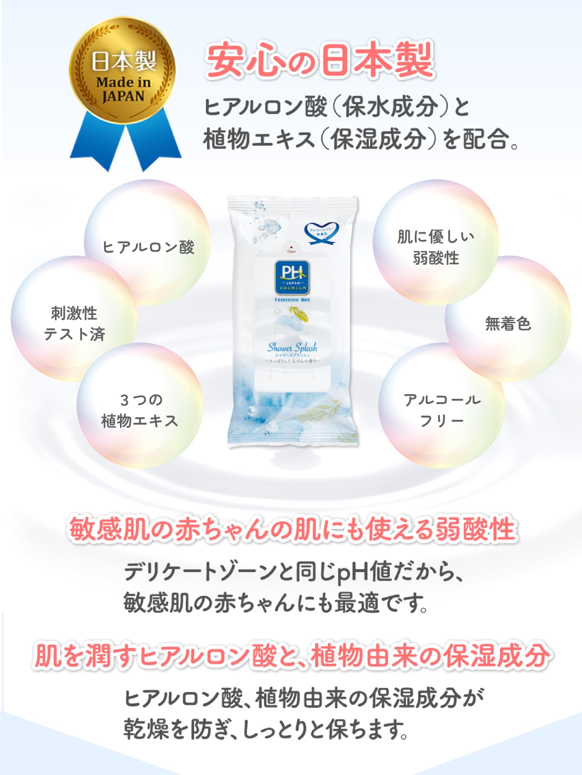 【サッパリ、いつでも清潔】ヒアルロン酸・3種の植物エキス(保湿成分)を配合。乾燥しがちなデリケートゾーンの潤いを保ち、余分な汚れだけを拭き取ります。いつものケアでトラブルから肌を守ります。