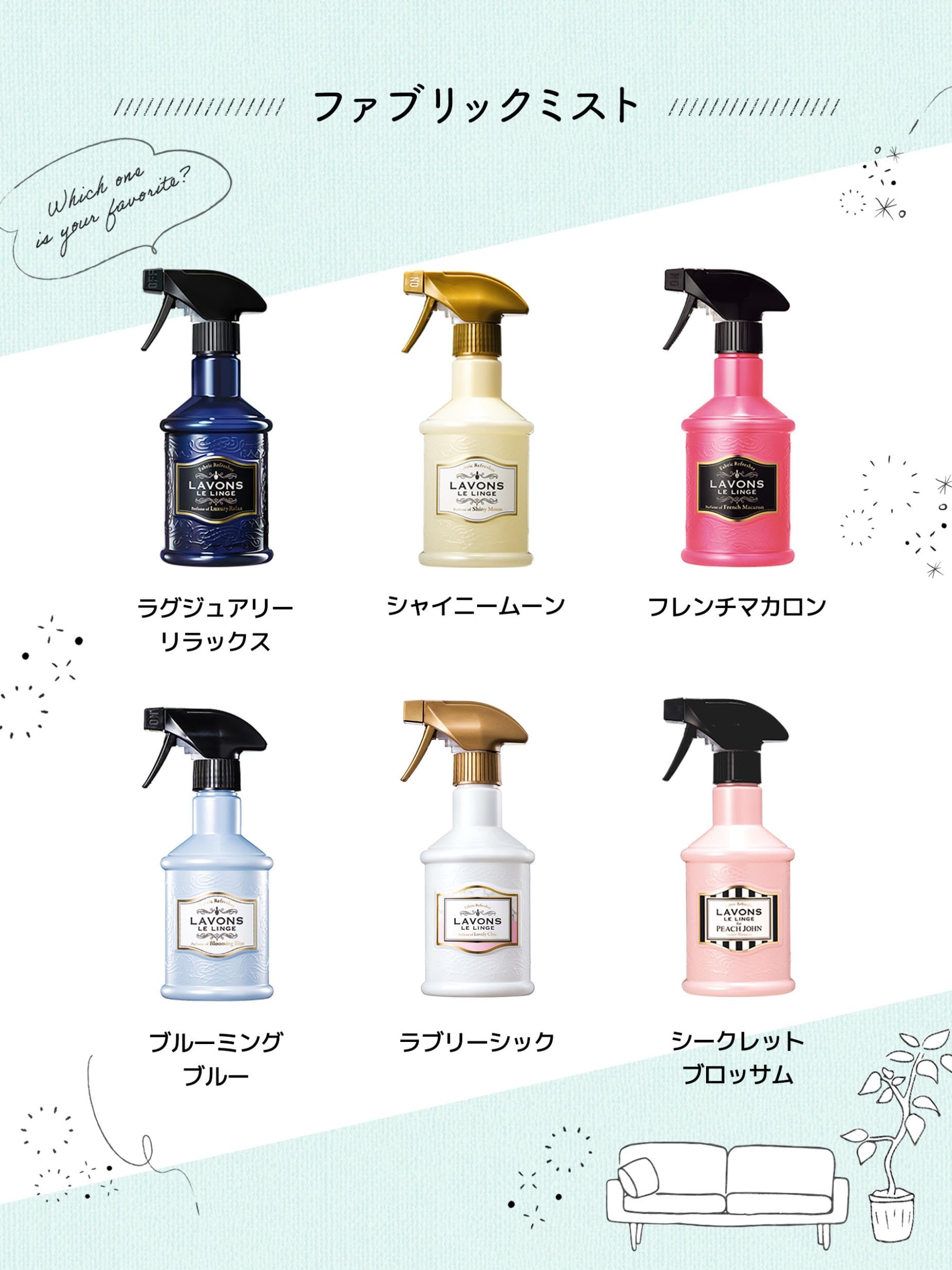 ●すぐに洗えないコートやソファ等のファブリック製品を心地よい香りに。