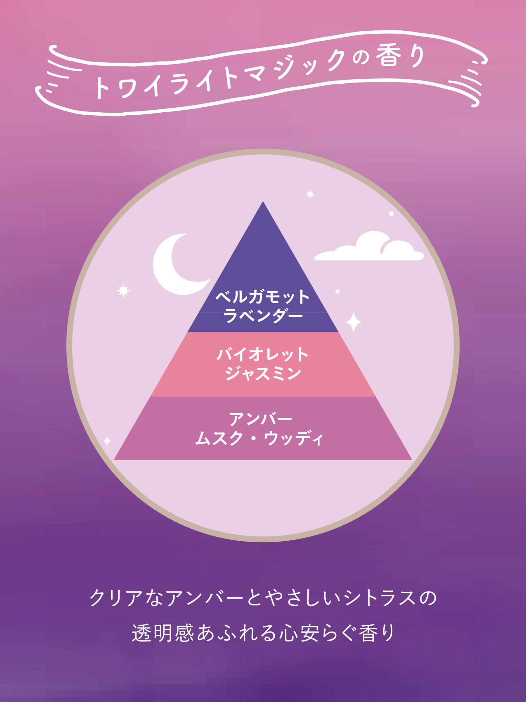 nクリアなアンバーとやさしいシトラスの新感覚アロマ、トワイライトマジックの香り。