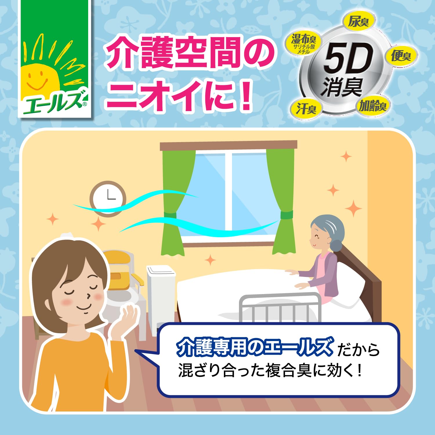 「5D消臭」が介護空間の複合臭(介護空間に漂う臭気成分)に効く。