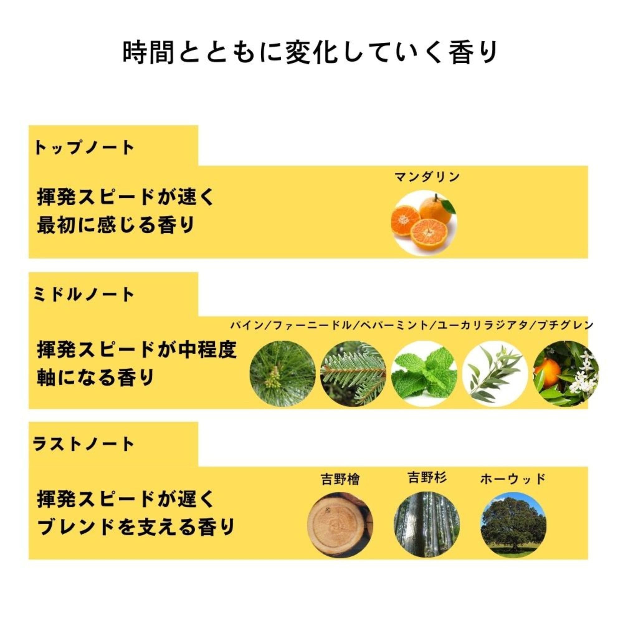 【上品な香り】ウッド ミント 柑橘のアロマオイルをブレンドし爽やかで上品な香り。呼吸を深くし、自分自身と向き合わせてくれる落ち着きのある香り(吉野檜 吉野杉 ホーウッド パイン ファーニードル ペパーミント ユーカリラジアタ プチグレン マンダリン)