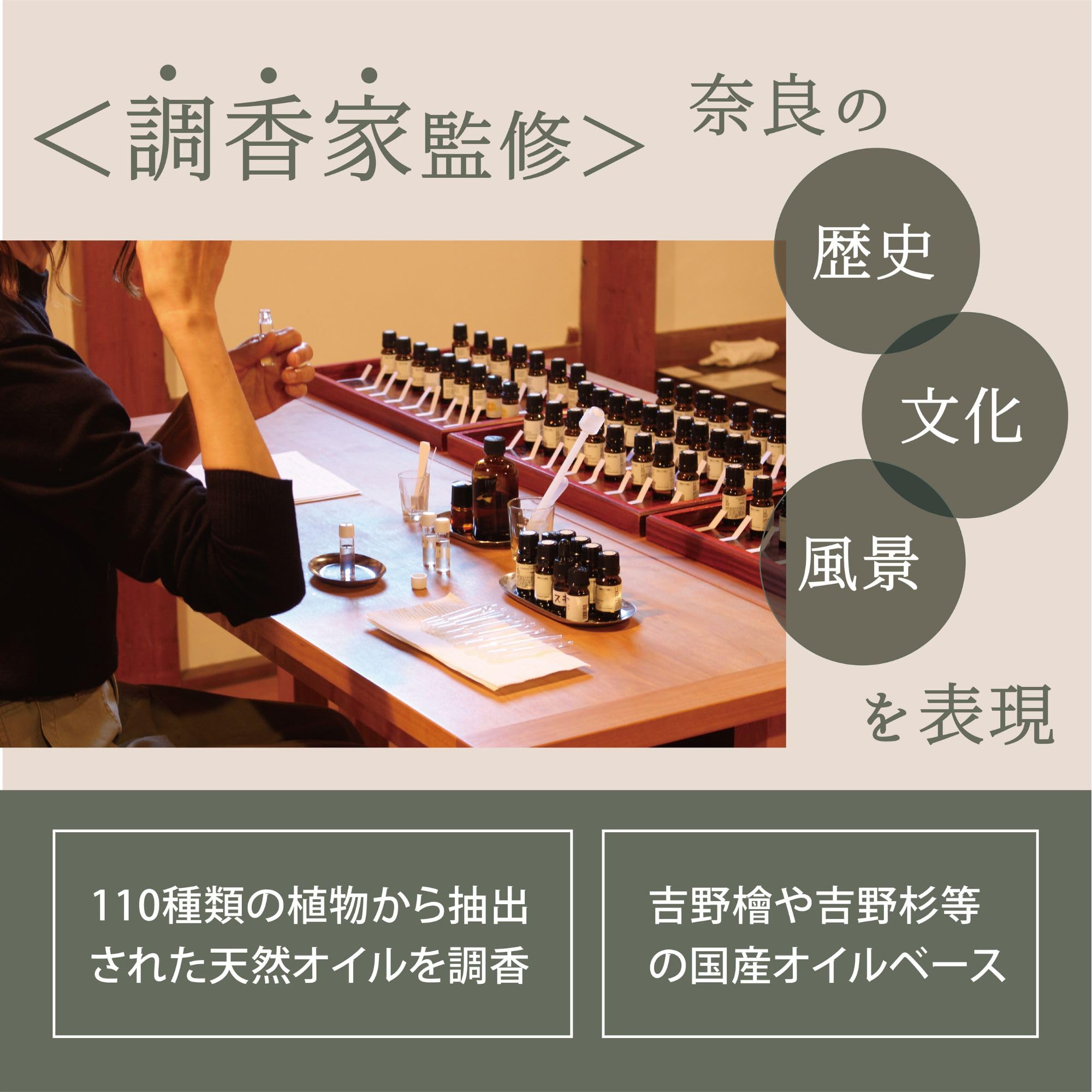 【110種以上の天然精油から選りすぐり調香された究極の香り】奈良の歴史、文化、風景を香りで表現した「奈良の香り」除菌スプレー。揮発スピードの異なる天然アロマオイルを配合し、時間とともに変化する香りで、究極の癒しを体感。