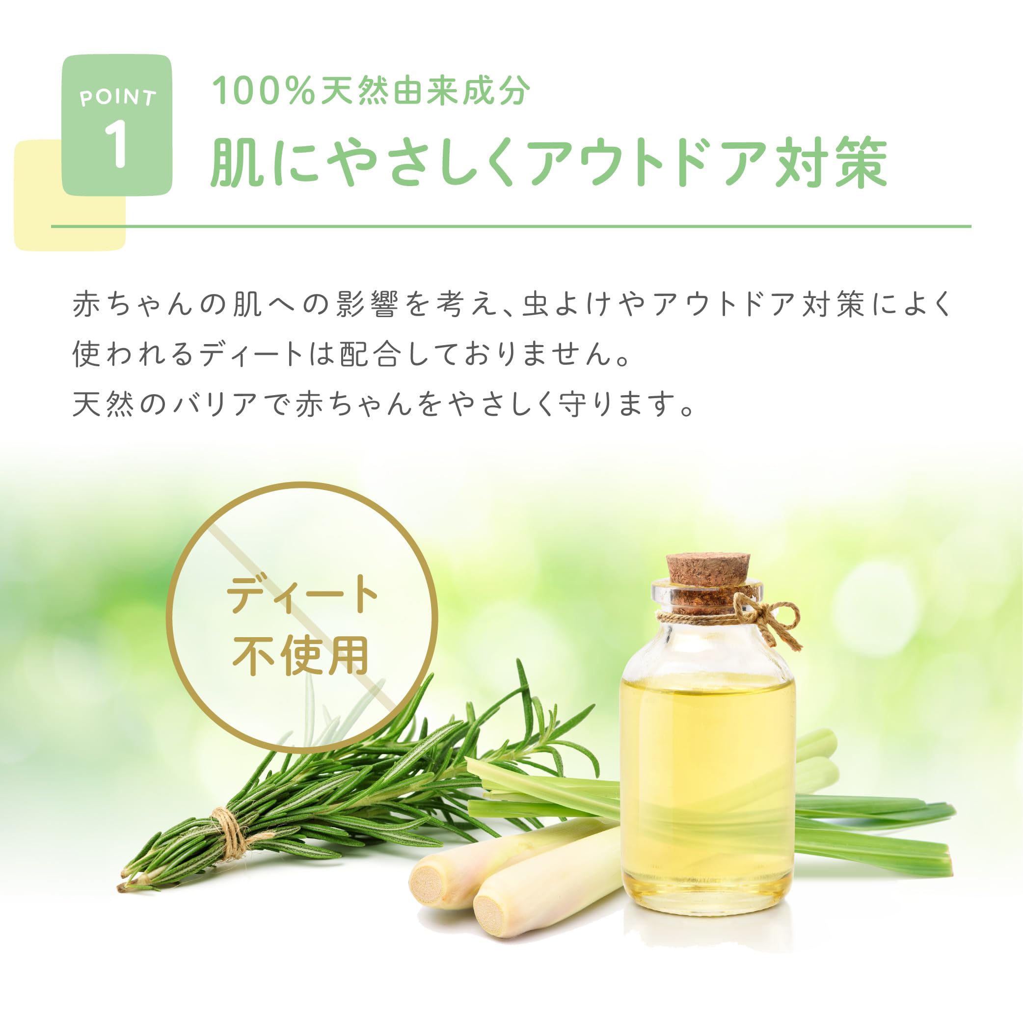 【 ディート不使用&アロマの香り 】多くのアウトドアスプレーに使用されているディートは不使用。オレンジ果実水やレモングラス葉油、ローズマリー葉油、セイヨウハッカ油などの天然のバリアでやさしく守ります。天然のアロマを使用で、赤ちゃんも嫌がりません。虫が気になる季節にも清涼感のある香りで、さっぱりとお使いいただけます。