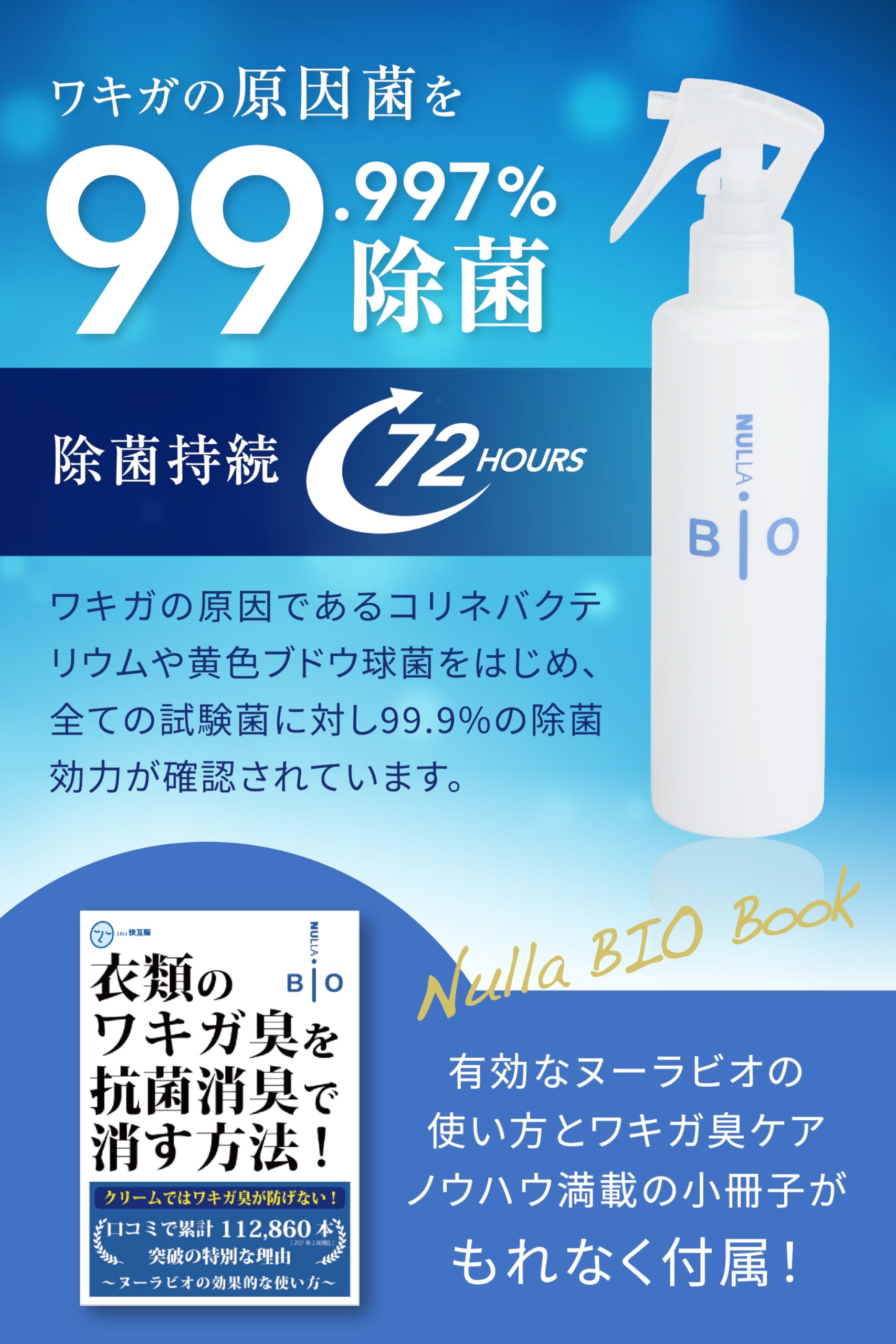 ?【ワキガの原因菌を99.997%カット】NUULA Bio(ヌーラビオ)はワキガ臭を防ぐために開発された衣類用の除菌消臭剤です。ワキガ菌に対して99.9%の除菌効力と72時間の除菌持続時間が確認されています。消臭スプレー ヌーラビオを衣類のワキ部に消臭スプレーしておくことでワキガ臭・体臭の発生を防ぎ、着替えた直後のような無臭状態をキープできます。