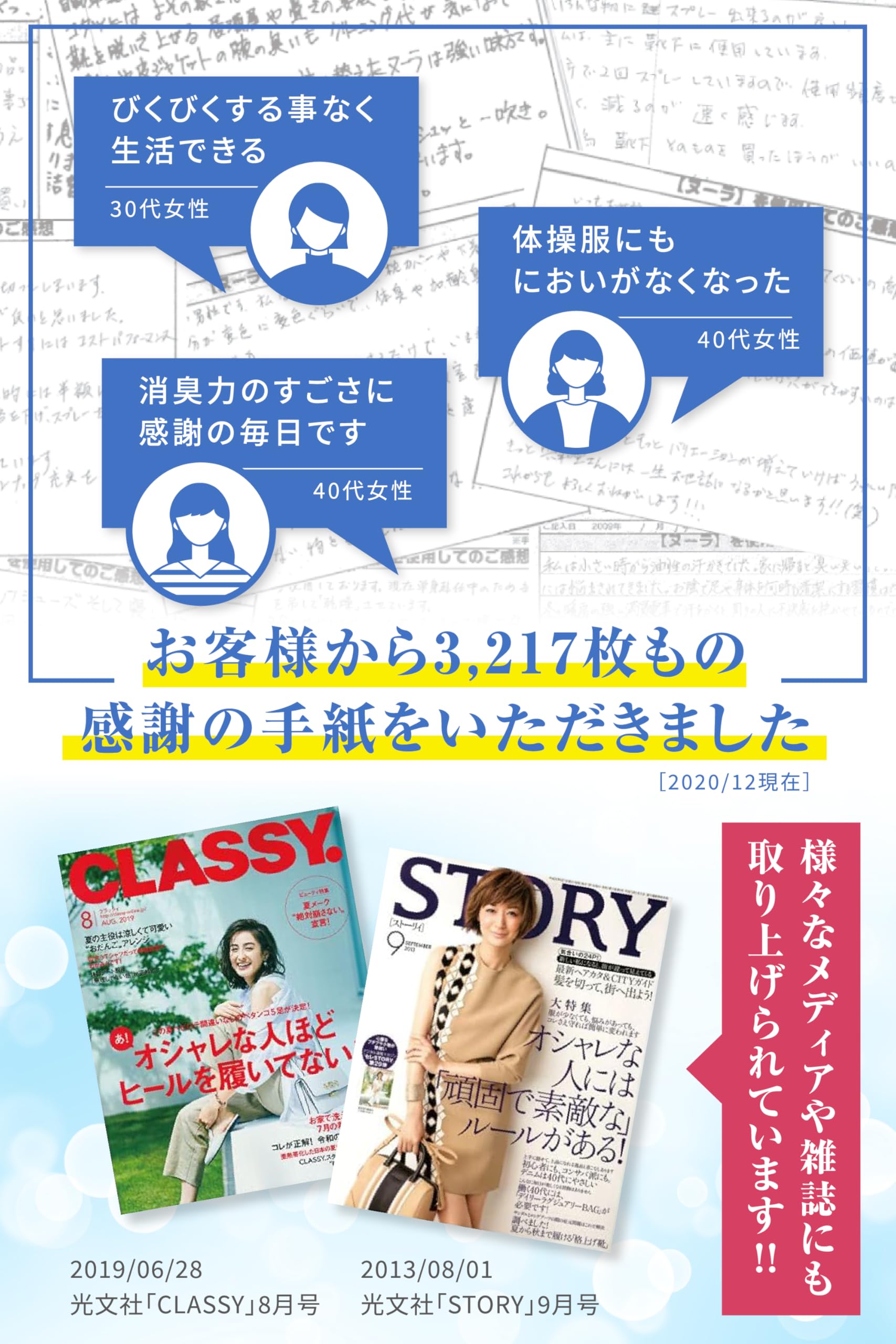 ?【スプレーするだけ!簡単使用方法】消臭スプレーを衣類のワキ部に、乾いたら着るだけです。水をかけられる繊維なら使用可能。洗濯後濡れている状態でも、乾かした状態でもOK。暑い夏。ワキガ菌をはじめ様々なニオイ菌の繁殖を抑え、イヤなニオイの発生を防ぎます。