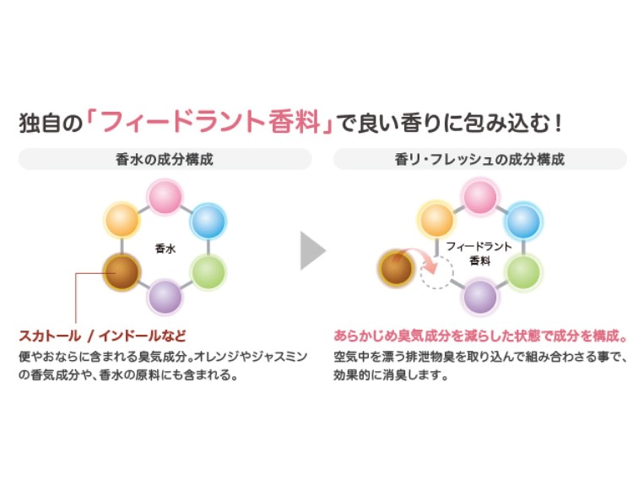 ●尿臭・便臭などの悪臭成分を香り成分の一部として取り込むことで、良い香りに変えて消臭する「フィードラント香料」を使用した消臭芳香剤です。