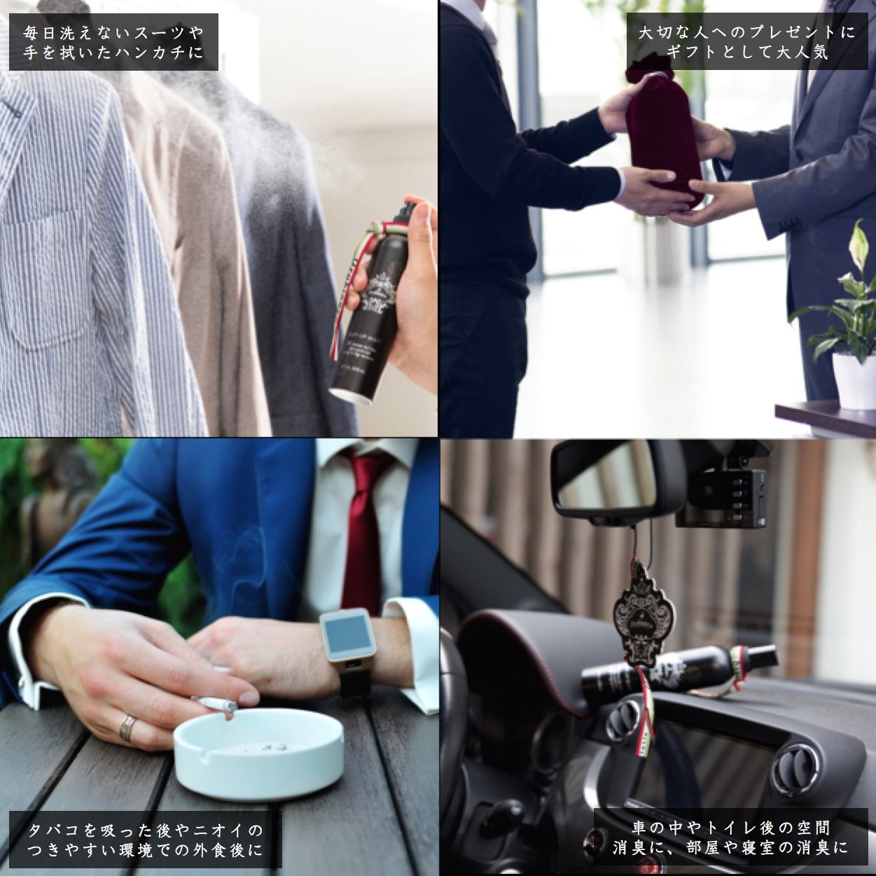スーツ等の衣類についたタバコの臭いや悪臭を除去し、爽やかな香りを付与し、出来る男を演出します。
