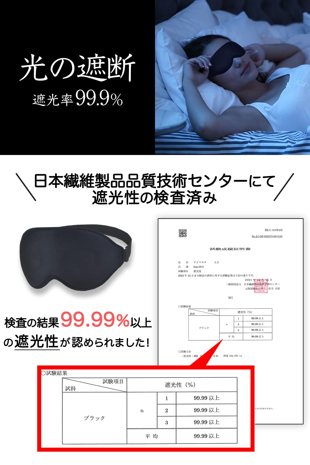 【国内認証済み 遮光率99.99%】 アイマスクの一番重要な役割は「光の遮断」です。 現代では充電中の小さい光や待機電源など暗い部屋では目立ってしまうため、電気を消すだけで真っ暗の環境を得る事は難しく また電気を消しても少し時間が経つと目が慣れてきて光を感じてしまいます。アイマスクを選ぶ際は遮光率を意識することが重要です。