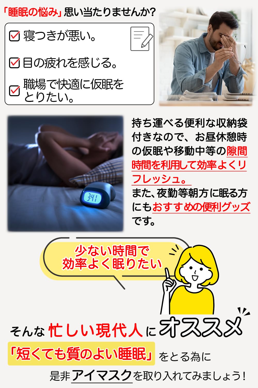 【目の癒し、休息】 最近は在宅ワークやおうち時間の増加により、スマホやパソコンの使用率増加に伴い目の疲れを感じる人が増えています。 アイマスクを付けると光が遮断されるので、まとまった睡眠の取れない細切れ睡眠の時や、夜勤後の睡眠時にも重宝します。