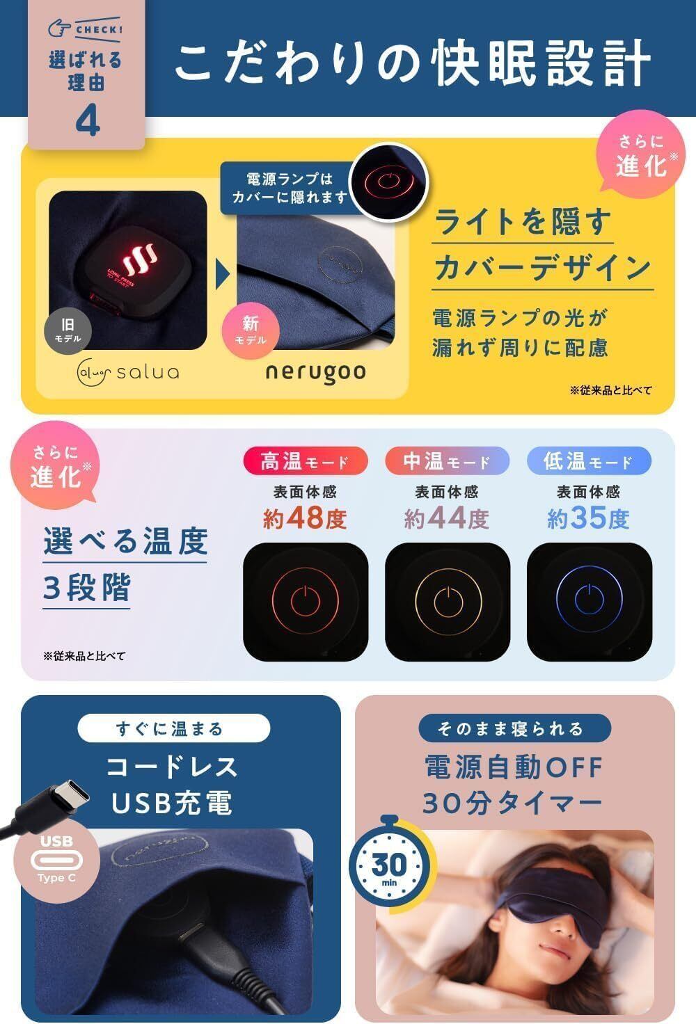 【生まれ変わった、大人気 アイマスク 】 累計販売45万個超のsalua ホットアイマスク が新しいブランド「nerugoo」になって商品もリニューアル。 お客様の声をヒントに、もっと心地よく、使いやすい 安眠グッズ にパワーアップしました。