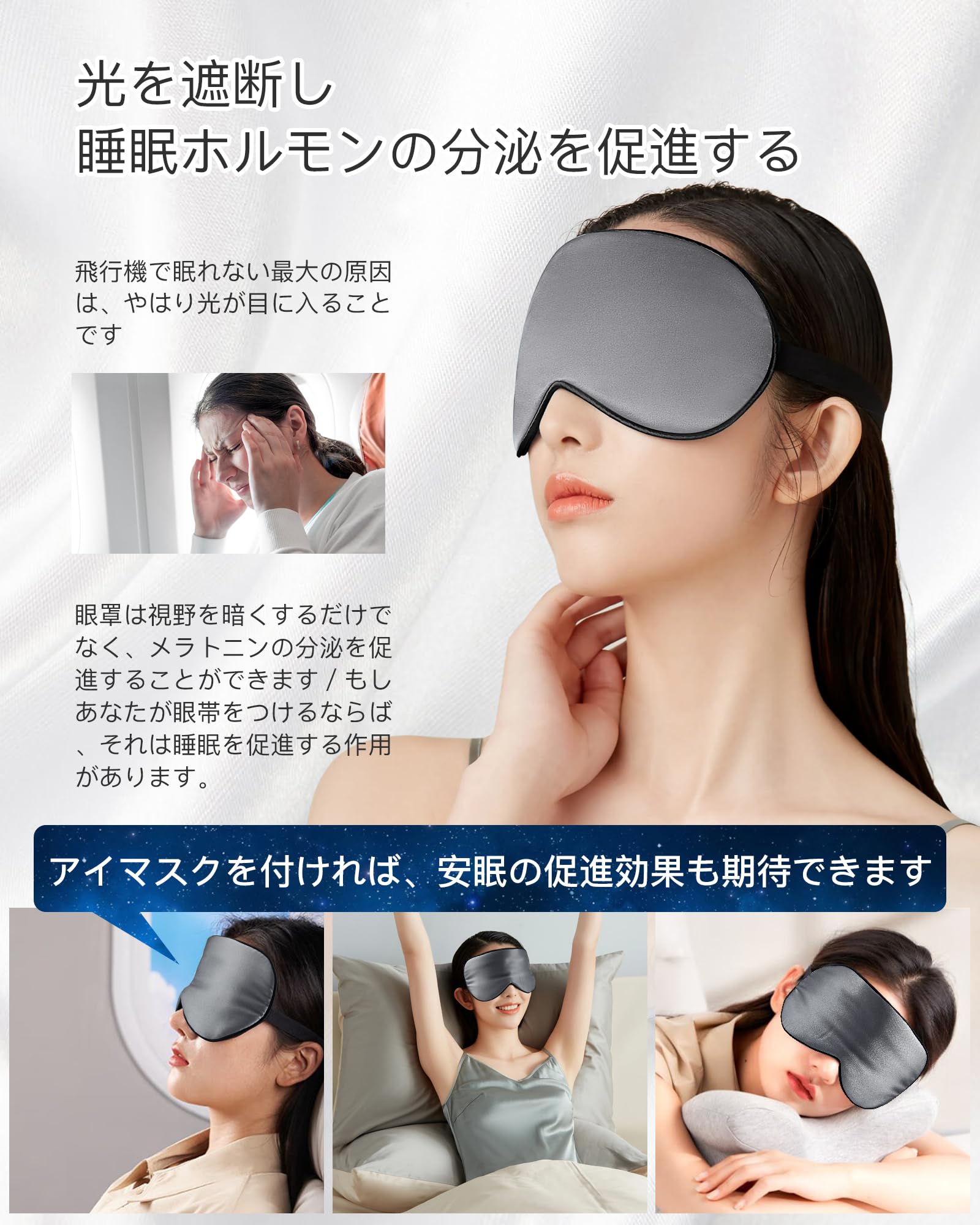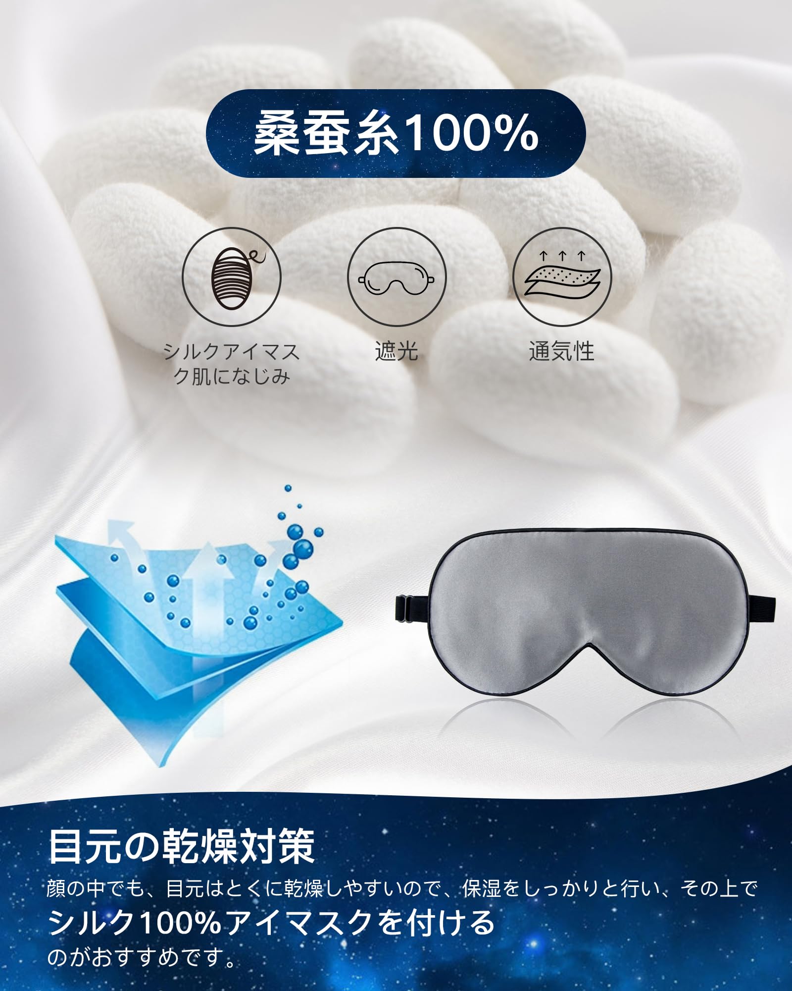 アイマスク 睡眠用 シルクアイマスク 天然シルク製 夏用 通気性 圧迫感なし 眼罩 遮光 快眠グッズ 目隠し アイマスク 超軽量 洗濯可能 自由調整可能(グレー)